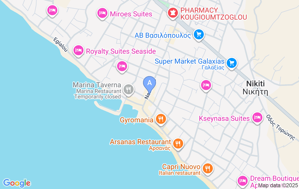 Cea mai ușoară metodă de a găsi unitatea de cazare este să faceți dreapta în strada Neakitou de la semaforul de la intrarea în Nikiti de pe drumul principal și să conduceți înainte aproximativ 600 de metri (pe partea stângă veți vedea o sală de jocuri pentru copii, care se află lângă proprietate).