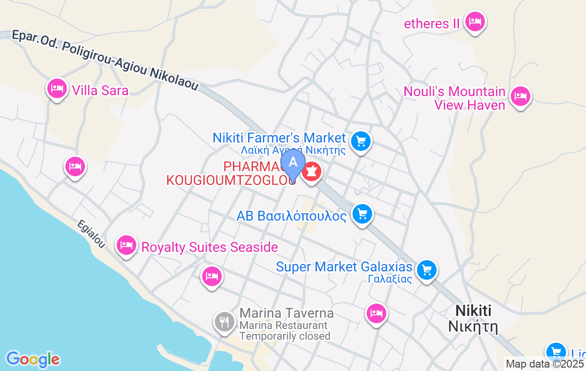 La intrarea în Nikiti, imediat după cafeneaua Mikel, virați la dreapta după 350m, apoi mergeți drept încă aproximativ 230m. La stânga veți vedea complexul Bomo Lux.