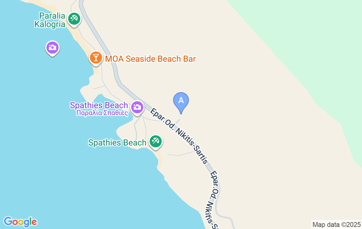 Spathies Hideaway Maisonette este situată într-un mediu liniștit și calm, ideal pentru o vacanță relaxantă, la aproximativ 170 de metri de frumoasa plajă Spathies. Plaja este alcătuită din două golfuri separate, unul mai mic și unul mai mare, care oferă o atmosferă unică și un sentiment de intimitate. Marea este turcoaz și cristalină, nisipul este fin și plăcut pentru mers, iar apa este liniștită și puțin adâncă – perfectă pentru înot. La aproximativ 350 de metri se află și renumita plajă Kalogria, care oferă condiții excelente pentru înot, precum și o varietate de restaurante și baruri pe plajă pentru un plus de relaxare în timpul sejurului. Această locație este ideală pentru familii și cupluri care doresc să se bucure de un mediu liniștit, înconjurat de natură.