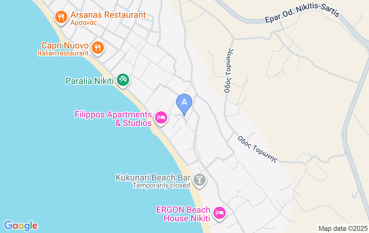 Plaja orașului, o varietate mare de taverne și baruri, în Nikiti, se află la doar 70 m distanță. Cel mai apropiat supermarket mai mare, Masoutis, este la aproximativ 900 m, iar Lidl la aproximativ 1,5 km de cazare.