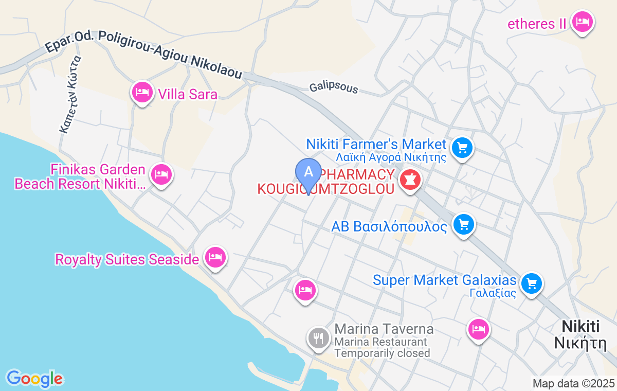 Vila Naiada este o nouă unitate de cazare completă situată într-o zonă liniștită dintr-una dintre cele mai populare stațiuni de vacanță, Nikiti. Această oază de relaxare, departe de agitație și zgomot, emană confort și eleganță, iar camerele spațioase și luminoase sunt mobilate modern cu piese de mobilier de calitate. Această locație se află la 550m de plajă și la 1,5km de partea veche a orașului Nikiti, care este deosebit de romantică în orele serii. Un supermarket mai mare, Vasilopulos, este la aproximativ 700m de unitatea de cazare, în timp ce Masutis este la 1,4km.