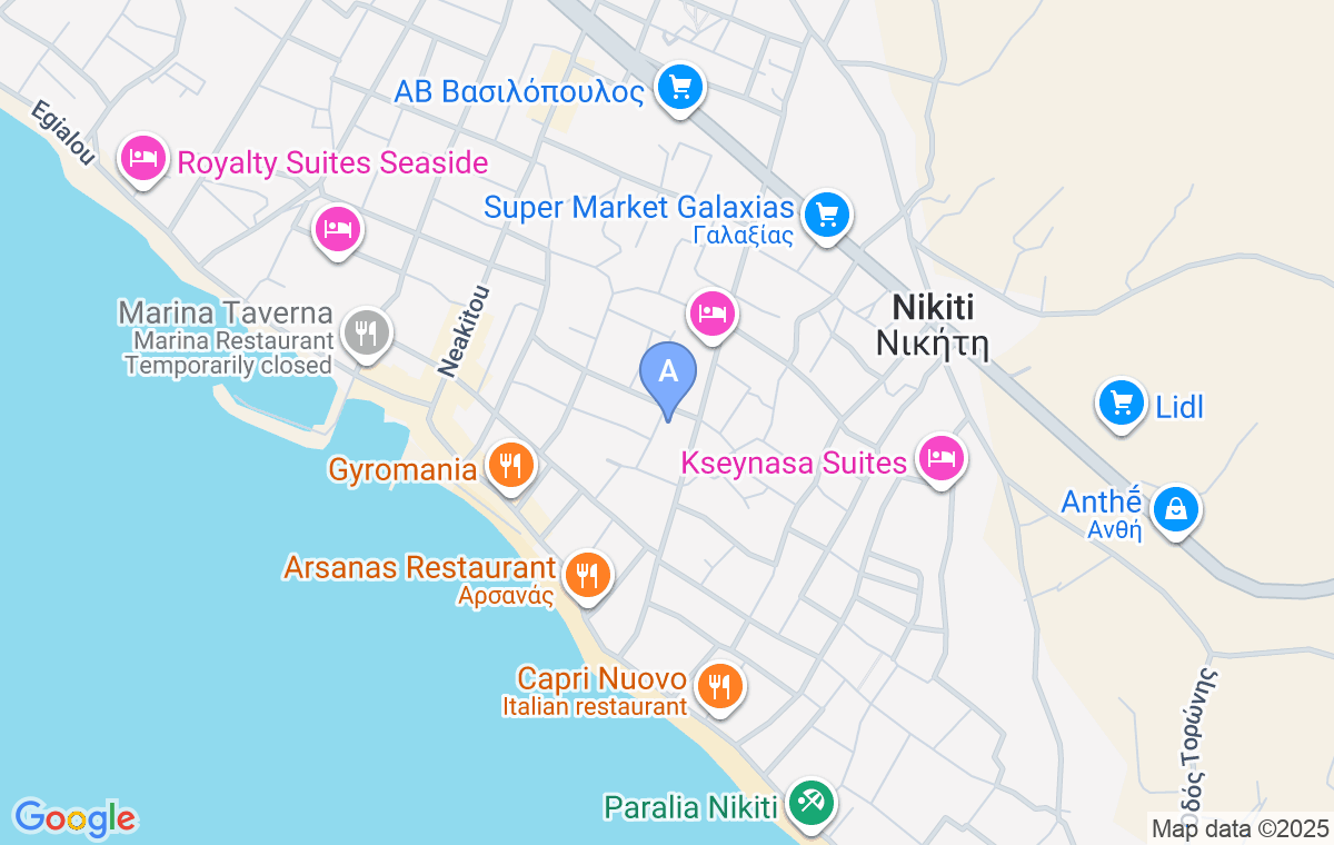 Oasis Luxury Apartments este situat în localitatea Nikiti, la începutul peninsulei Sithonia, la intersecția dintre malul vestic și cel estic. Această cazare este situată la 300m de plajă.