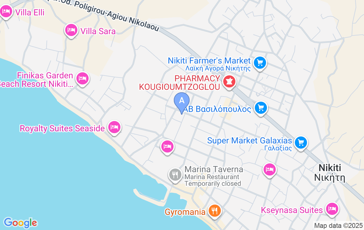 Artemis House se află în localitatea Nikiti, la începutul peninsulei Sithonia, la 450m de plajă și 500m de marină, faleză și restaurante. Cazarea reprezintă locul ideal pentru relaxare, cu detalii alese cu grijă și toate facilitățile necesare pentru o ședere confortabilă.