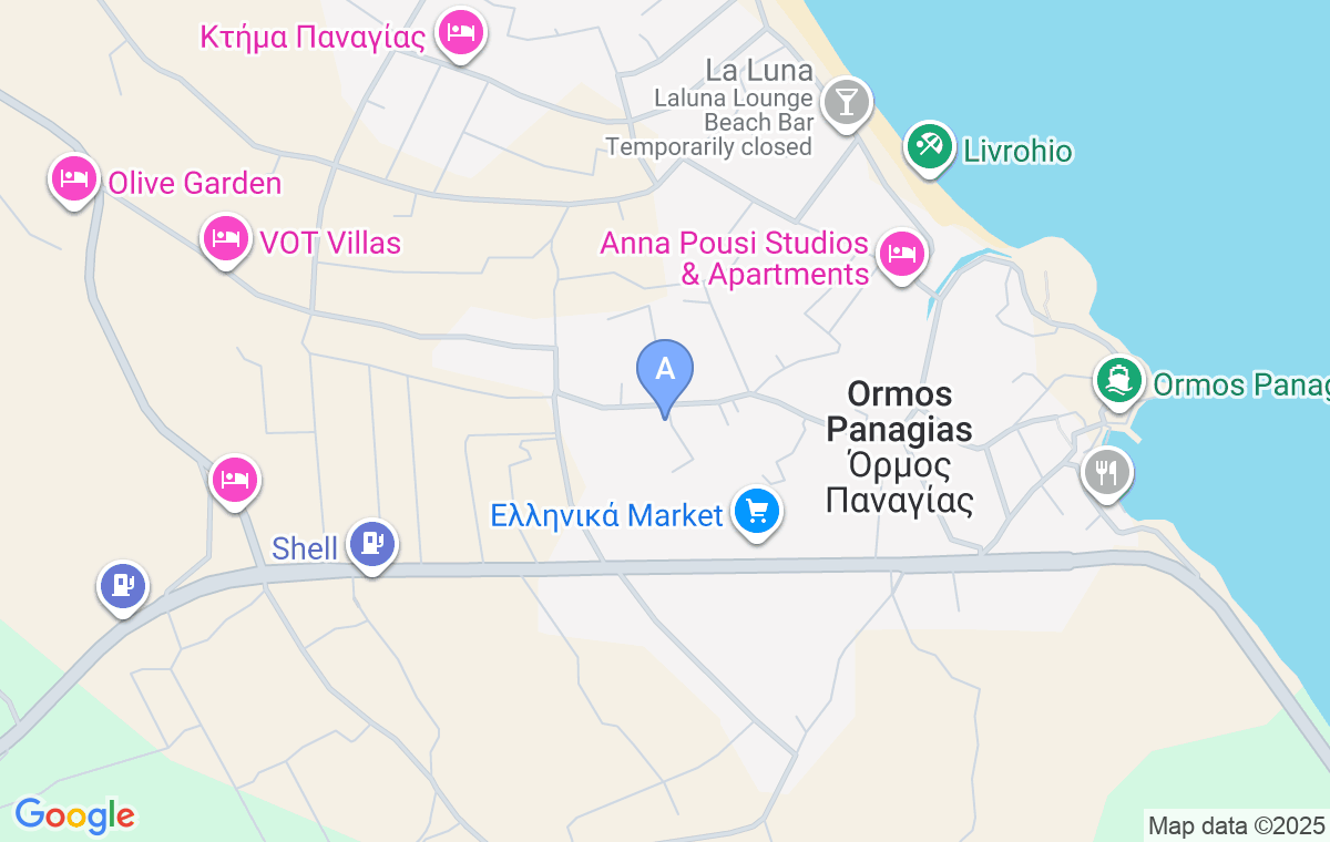 Ormos Apartments se află la aproximativ 850 m de plajă, și la aproximativ 900 m de centrul Ormos Panagias, unde se găsesc taverne și un mic magazin.