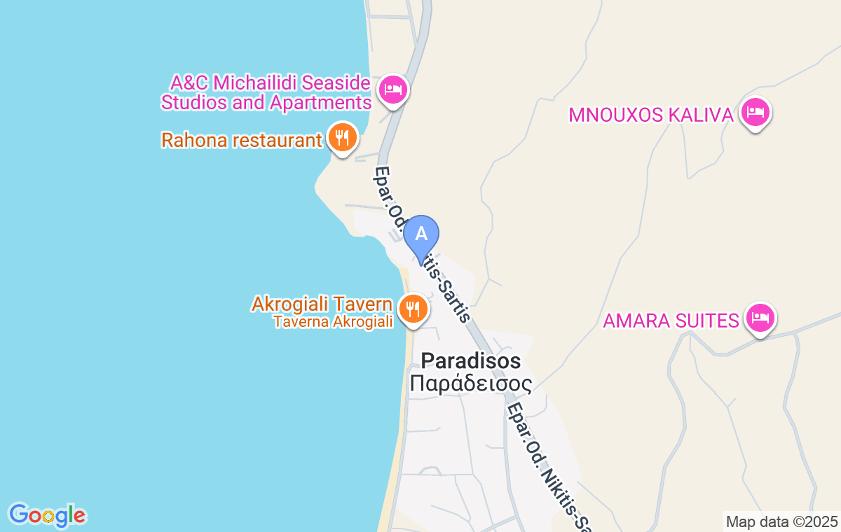 Veți găsi proprietatea la capătul promenadei, la ieșirea din zona Paradisos spre Nikiti.
