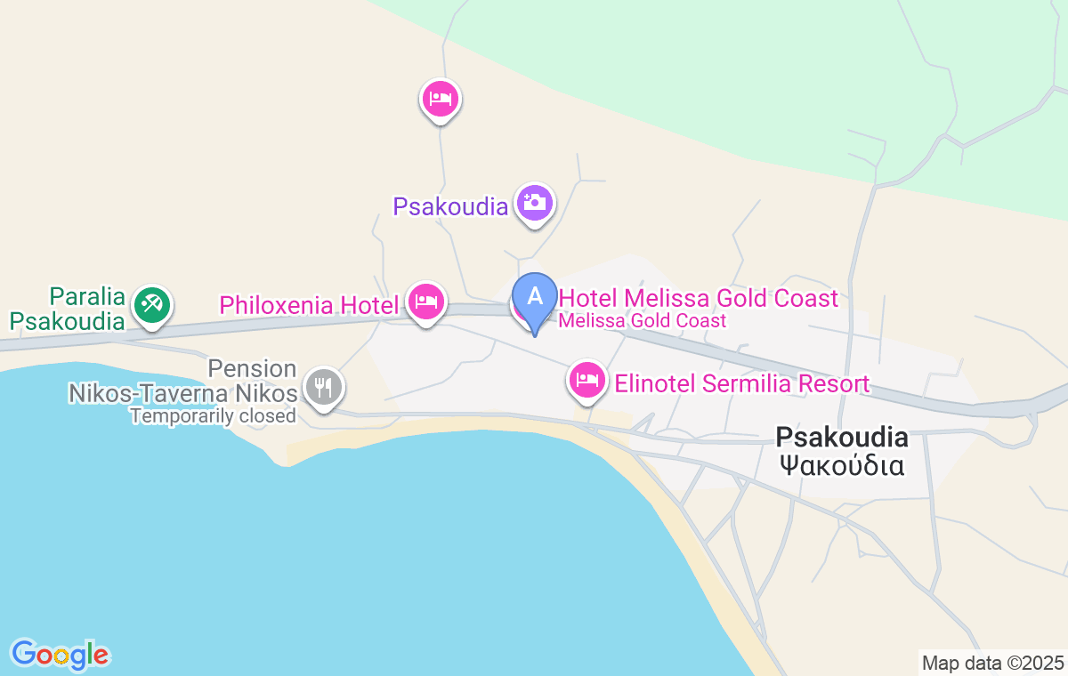 Hotelul Melissa Gold Coast este situat în centrul Psakoudiei și se poate ajunge la el de pe șosea sau din centru. Dacă ajungeți la hotel trecând prin localitate, după ce intrați în Psakoudia, după o scurtă plimbare, pe partea stângă veți vedea hotelul Cronwell Resort Sermilia. Închiriați-vă pe strada îngustă situată pe partea dreaptă a hotelului, continuați înainte, apoi virați la stânga și după aproximativ o sută de metri ușoară urcare, veți vedea hotelul într-o pădure de pini, de pe partea dreaptă.