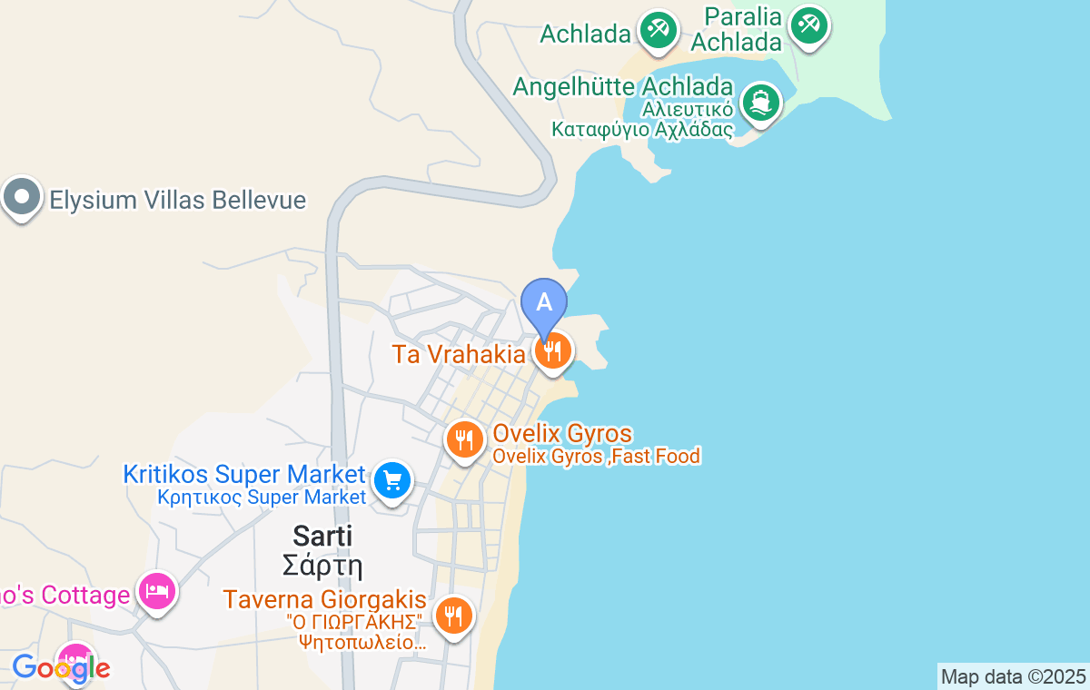 Venind dinspre Vourvourou, virați în a doua stradă la stânga după intrarea în Sarti. Continuați pe această stradă până la capăt, apoi virați la stânga și după aproximativ 100 de metri veți vedea casa Gianna pe partea stângă. Deoarece centrul este închis seara din cauza promenadei, este mai sigur să virați în a patra stradă la stânga, lângă clubul Fact, și să continuați pe această stradă până la capăt și apoi să virați din nou la stânga și după 350 de metri veți vedea casa pe partea stângă.