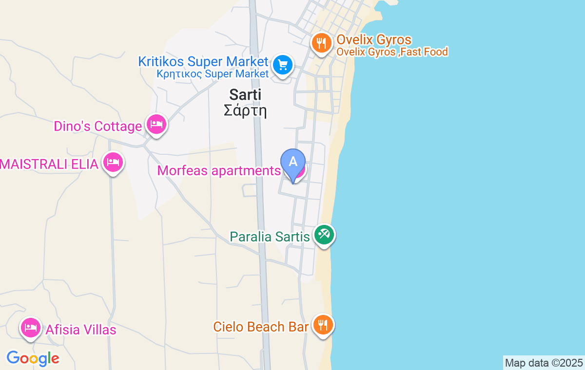 Venind dinspre Vurvuru, când intrați în Sarti, în fața vilei Doxa (care se află pe partea dreaptă), se află virajul către terenul de fotbal. Virajul se face în acea stradă, apoi la a doua stradă la stânga, iar apoi la a patra stradă la stânga, la 60m, pe partea stângă, se află Eolica Rooms.