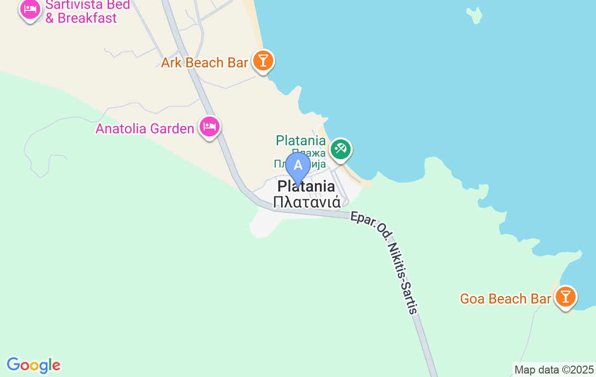 Dacă călătoriți dinspre nord pe șoseaua principală Sarti-Sikija, după ce ieșiți din Sarti, veți vira la stânga pe un drum de pământ către plaja Platania. Veți merge pe acest drum drept aproximativ 200m, apoi veți vedea această cazare în partea dreaptă.