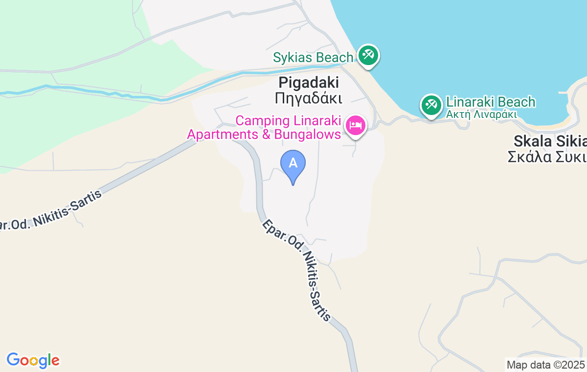 Dacă mergeți pe drumul principal de la Sarti spre Sikia, trebuie să continuați înainte către plajele Pigadaki și Linaraki după ce ați trecut de marele intersecție la dreapta care duce spre satul Sikia. Veți vedea brutăria Hatzis la dreapta, după care veți vira în a doua stradă la stânga (după aproximativ 350 de metri), continuați drept și după 180 de metri veți vedea Achilleas Apartments pe partea dreaptă.