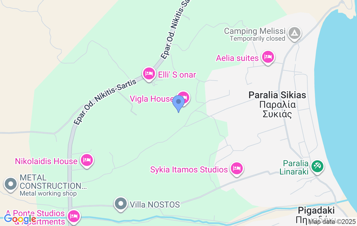 Vigla Summer House este situat într-o zonă liniștită și împrejmuită de verdeață, la aproximativ 4 kilometri de centrul Sikiei și la doar 750 de metri de plaja cu nisip. Datorită acestei locații, oaspeții acestei cazări se pot bucura de liniște și intimitate, în timp ce proximitatea de mare le permite să ajungă la mal în doar câteva minute. Combinarea distanței de agitația turistică cu accesibilitatea facilităților locale face această cazare potrivită pentru cei care caută o vacanță simplă, confortabilă și relaxantă.