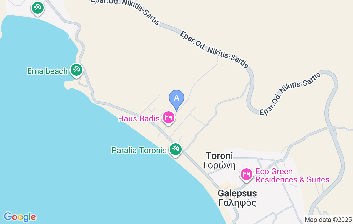 După ce intrați în Toroni, conduceți pe strada de-a lungul plajei, treceți de taverna Afroditi și, la 500m mai departe, virți la a patra stradă după tavernă, iar când virați, mai conduceți aproximativ 100-130m și veți vedea pensiunea Irini.