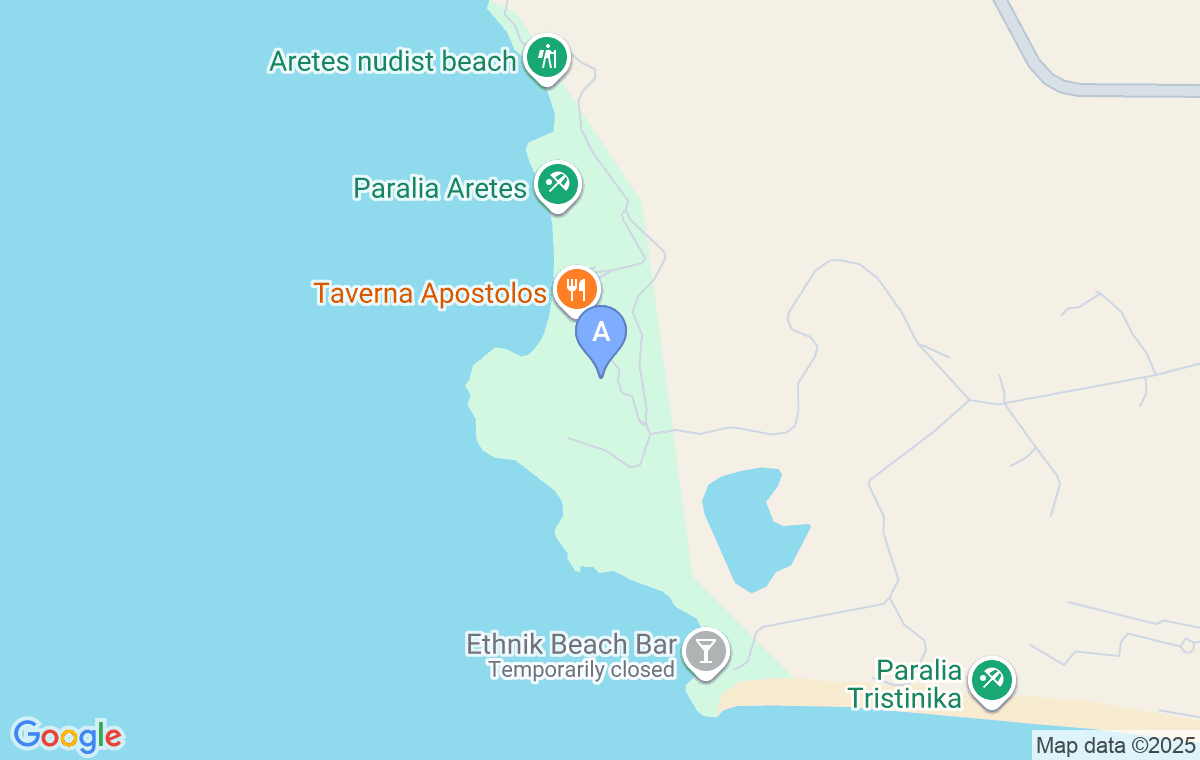 Ismini House se află într-o așezare construită în stilul cicladic, pe coasta de vest a peninsulei Sithonia, la 110m distanță de plaja cu nisip auriu și culoarea turcoaz a mării, plaja Aretes, iar de localitatea mai mare cea mai apropiată, Toroni, se află la o distanță de 5km. În apropierea cazării se găsește doar o tavernă și un bar pe plajă, ceea ce asigură o vacanță liniștită departe de aglomerația și zgomotul caracteristice stațiunilor mai mari.