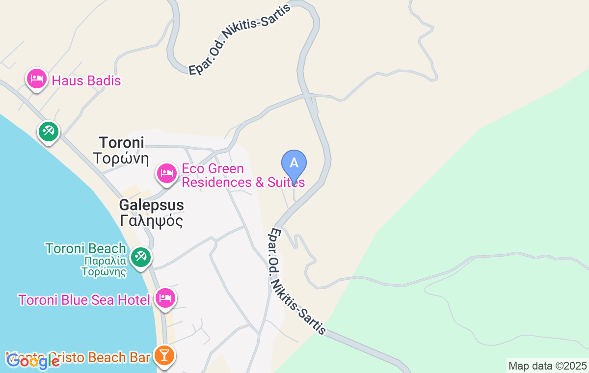 Risos Haus se află în Toroni, sub drumul principal, la o distanță de 900m de plaja și centrul orașului, unde puteți găsi și un supermarket. Este vorba despre o locație modernă, cu piscină, înconjurată de o curte spațioasă, ce dispune de studiouri cu capacitate de până la patru persoane.