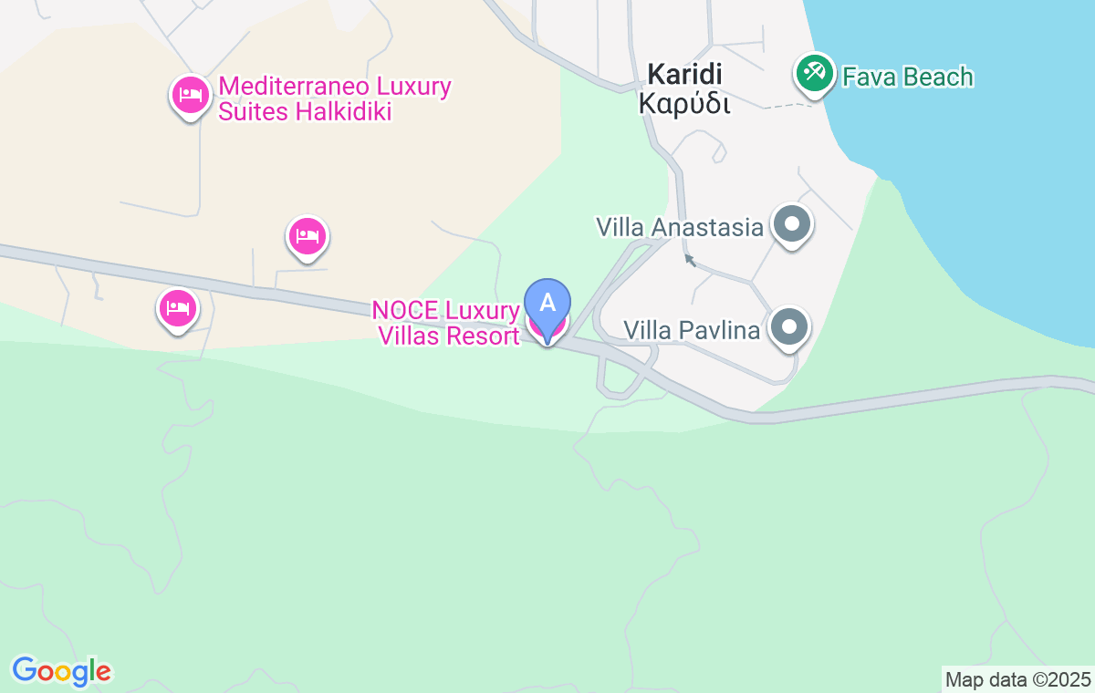 Noce Luxury Villas este un complex nou construit care se află în apropierea locului Vourvourou, pe coasta estică a peninsulei Sitonia, la 850 m distanță de cea mai apropiată plajă cu nisip și apă de culoare turcoaz, iar de plaja Fava sunt 1 km distanță.