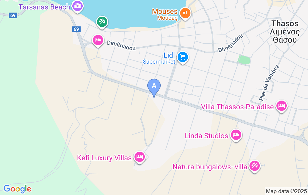 De la plaja orașului este la 2km distanță, iar de plaja Vournelis la 700m. Cel mai apropiat supermarket se află la aproximativ 150m distanță de locul de cazare și aici se pot achiziționa și unele produse de patiserie.