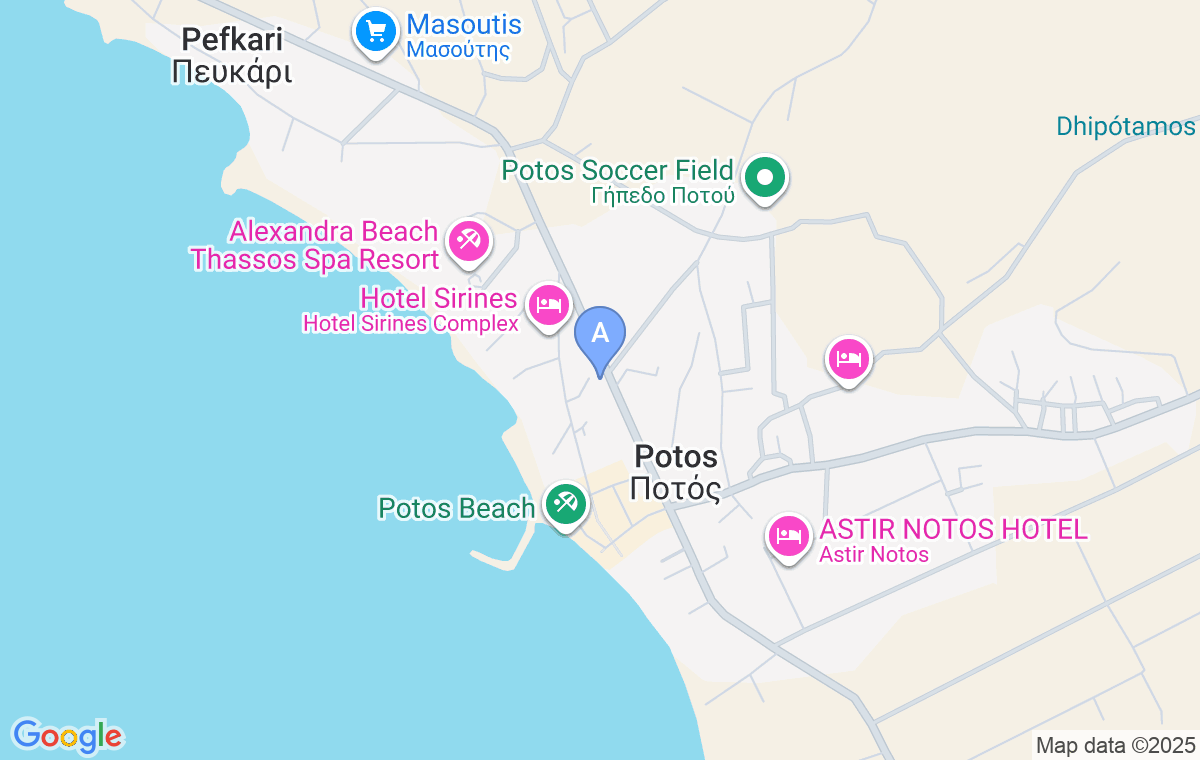 Dacă veniți dinspre Limenaria, mergeți pe drept înainte pe șosea și la începutul Potosului, înainte de intersecția centrală, pe partea dreaptă a șoselei veți vedea restaurantul George. Vila Irida este în spatele restaurantului, dar având în vedere că atât restaurantul, cât și vila sunt deținute de aceeași familie, este recomandat să opriți la restaurant, de unde proprietarul vă va duce la cazarea dumneavoastră.