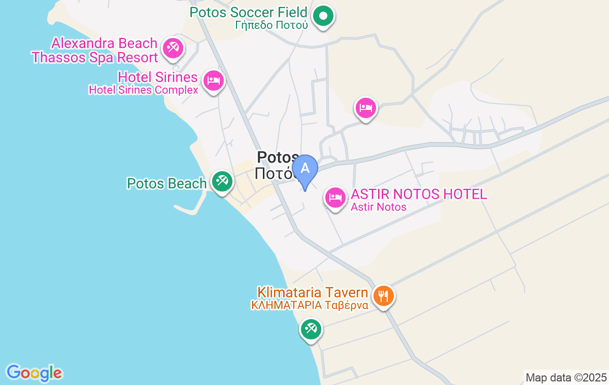 Se află în Potos, chiar în spatele bisericii, la doar 50 de metri de centrul orașului și de cel mai apropiat supermarket și la 200 de metri de plaja orașului.