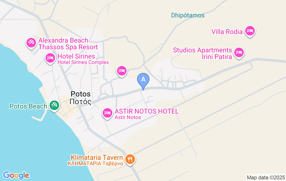 La intersecția centrală din Potos, virați la stânga lângă parcul de distracții și continuați înainte aproximativ 600m către Teologos. Scandia Villas se află pe partea dreaptă, există un semn pe drum.