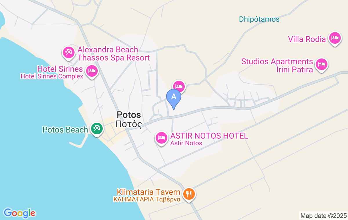 Se află la 450m de plajă, pe drumul care duce spre Theologos. Este la o distanță de 350 de metri de intersecția principală.