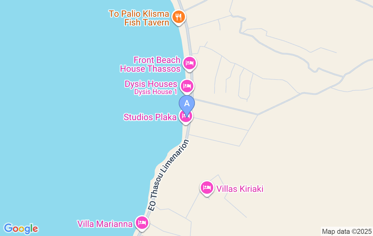 La partea de vest (către plajă) se află o zonă de relaxare în aer liber cu o acoperiș de lemn care vă oferă o umbră adâncă. De acolo puteți admira o panoramă spectaculoasă a plajei cu pietricele locale. Puteți chiar auzi sunetele valurilor care se izbesc de țărm. Cu toate acestea, ceea ce veți aprecia cel mai mult este senzația de briză egee pe față. Indiferent cât de călduros este ziua, nu veți simți acest lucru în această zonă de relaxare. Poate că uneori veți avea nevoie de o geacă! Este atât de plăcut răcoros!