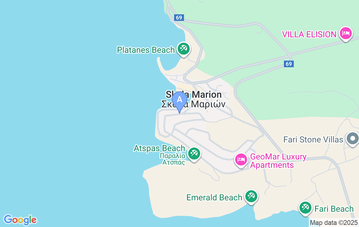 Cazarea este situată la 50 de metri de plaja principală și de primele magazine, farmacii, cafenele și restaurante. Având în vedere faptul că Skala Marijes este un oraș mic, celelalte două plaje (Sunset și Atspas) sunt, de asemenea, foarte aproape.