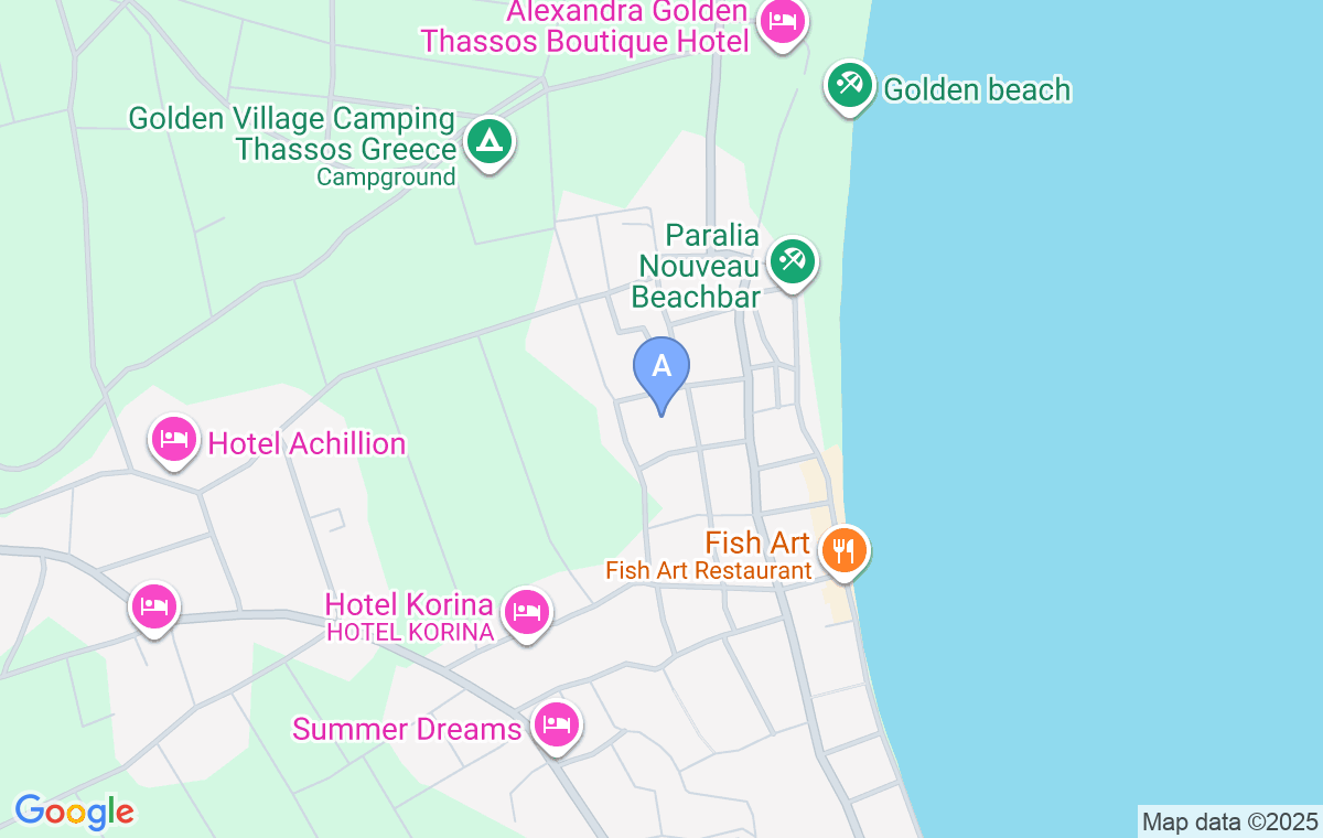 Dacă veniți dinspre Limenas, virați la stânga la hotelul Korina și continuați înainte până la intersecția cu clădirea Anna Apartments. Aici, virați la stânga și continuați până la unitatea de cazare Sole e Mare Studios, după care virați la stânga din nou, unde veți vedea complexul mare de mezonete pe partea dreaptă.