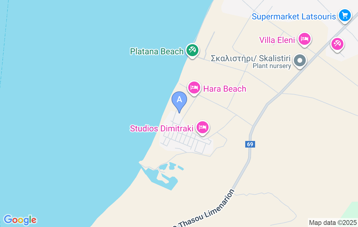 Vila Aspri Petra este situată în a doua linie de la mare, la doar 60m distanță de plaja cu nisip și nu departe de satul Skala Rahoni, un loc liniștit în nord-vestul insulei Thassos. Centrul satului, care include mai multe restaurante, cafenele, brutării, stație de benzină și un mare supermarket, se află la 2,7km distanță.
