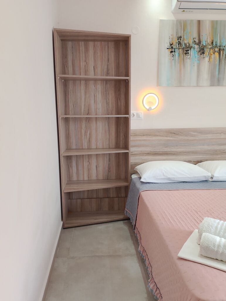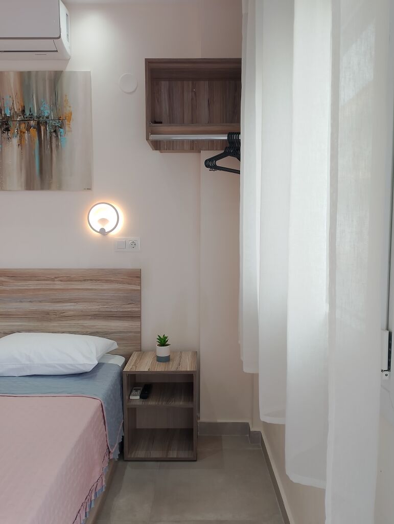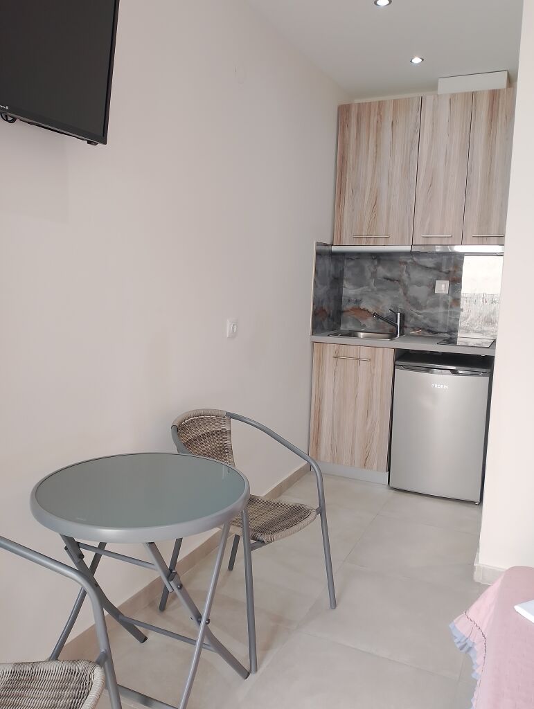 Fiecare studio capătă un farmec aparte datorită verandei amenajate cu un set de șezut, ideală pentru a te bucura de apusul soarelui sau pentru relaxare de seară cu muzică și un pahar de vin. De pe verandă se deschide o priveliște asupra străzilor fermecătoare din Nea Roda, decorate cu fațade colorate ale caselor și cu parfumul florilor proaspete.