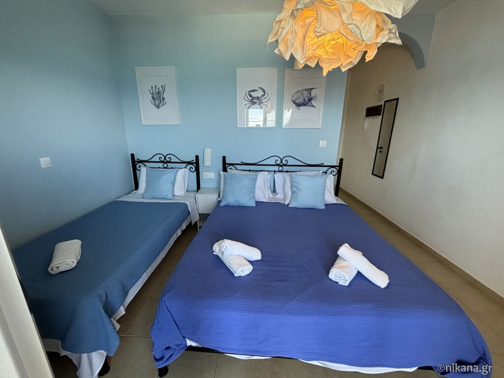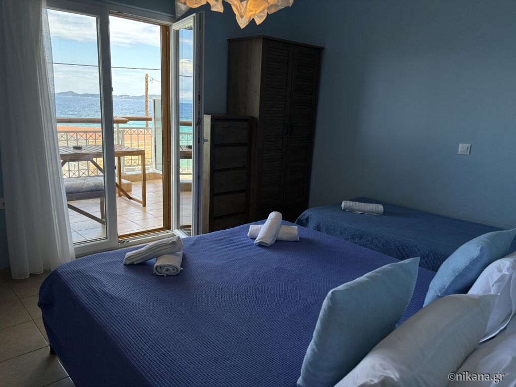 Toate unitățile de cazare au propriul balcon dotat cu mobilier de exterior. Studiourile au vedere directă sau parțială la mare, în timp ce apartamentul are vedere la curtea amenajată.