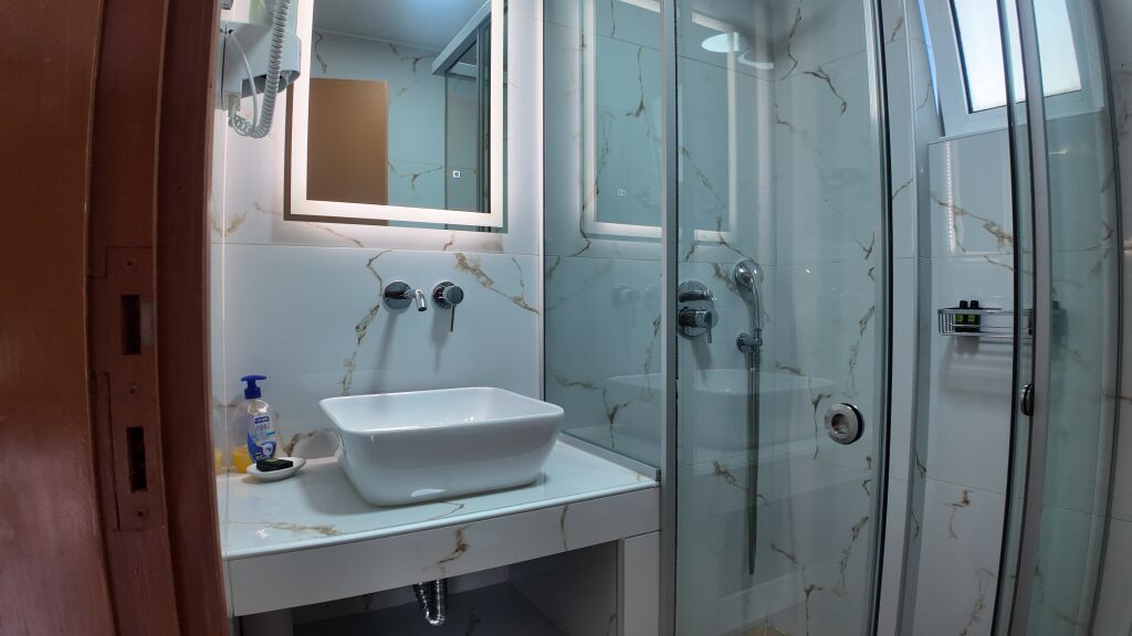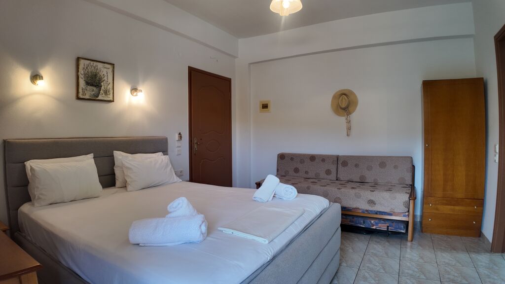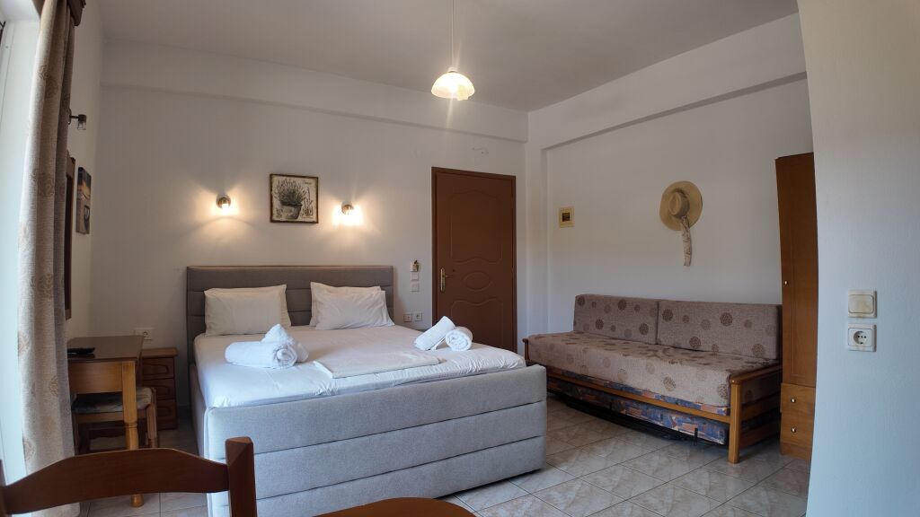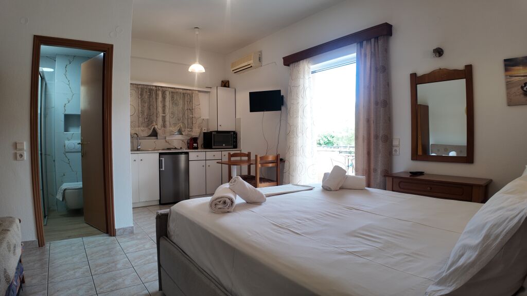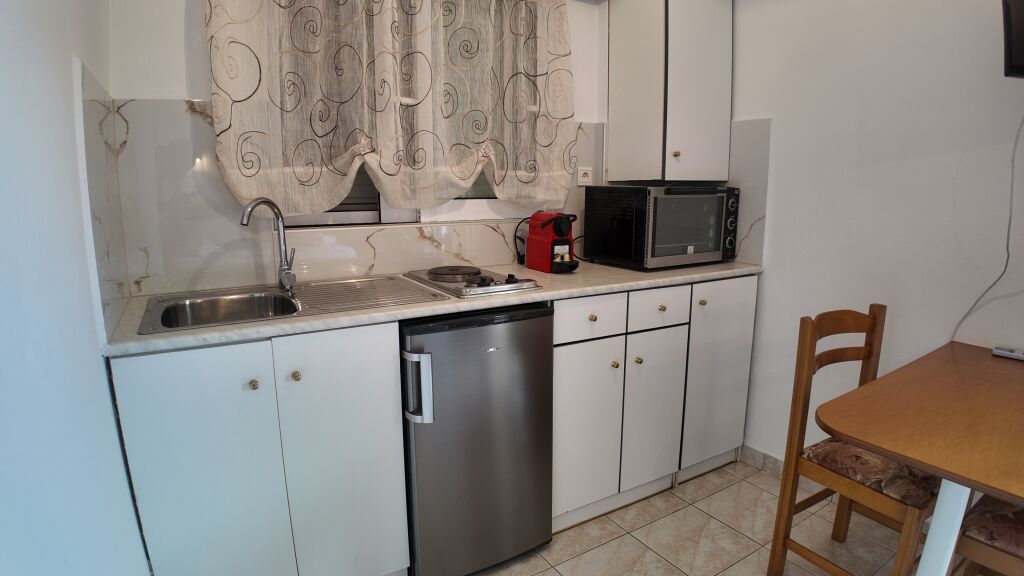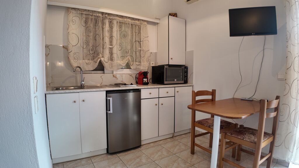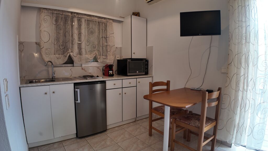 Un studio cu trei paturi are un pat matrimonial și o canapea, o bucătărie cu un aragaz cu două ochiuri, cuptor și un frigider mic, un bărbier cu uscător și o terasă mare.