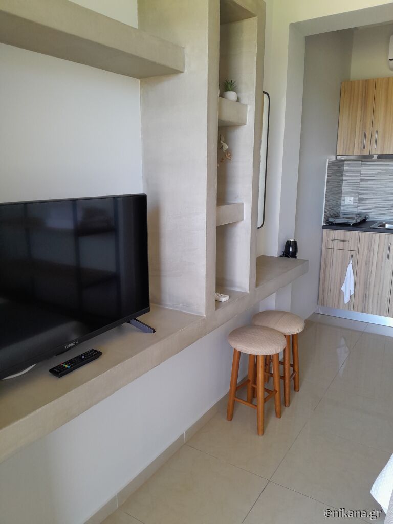 Studiourile au terase spațioase cu vedere spre mare (în depărtare), în timp ce în fața apartamentului se găsește o balansoar mare, iar în spate, o masă cu scaune. Plasele de insecte sunt instalate doar la ferestrele apartamentului.