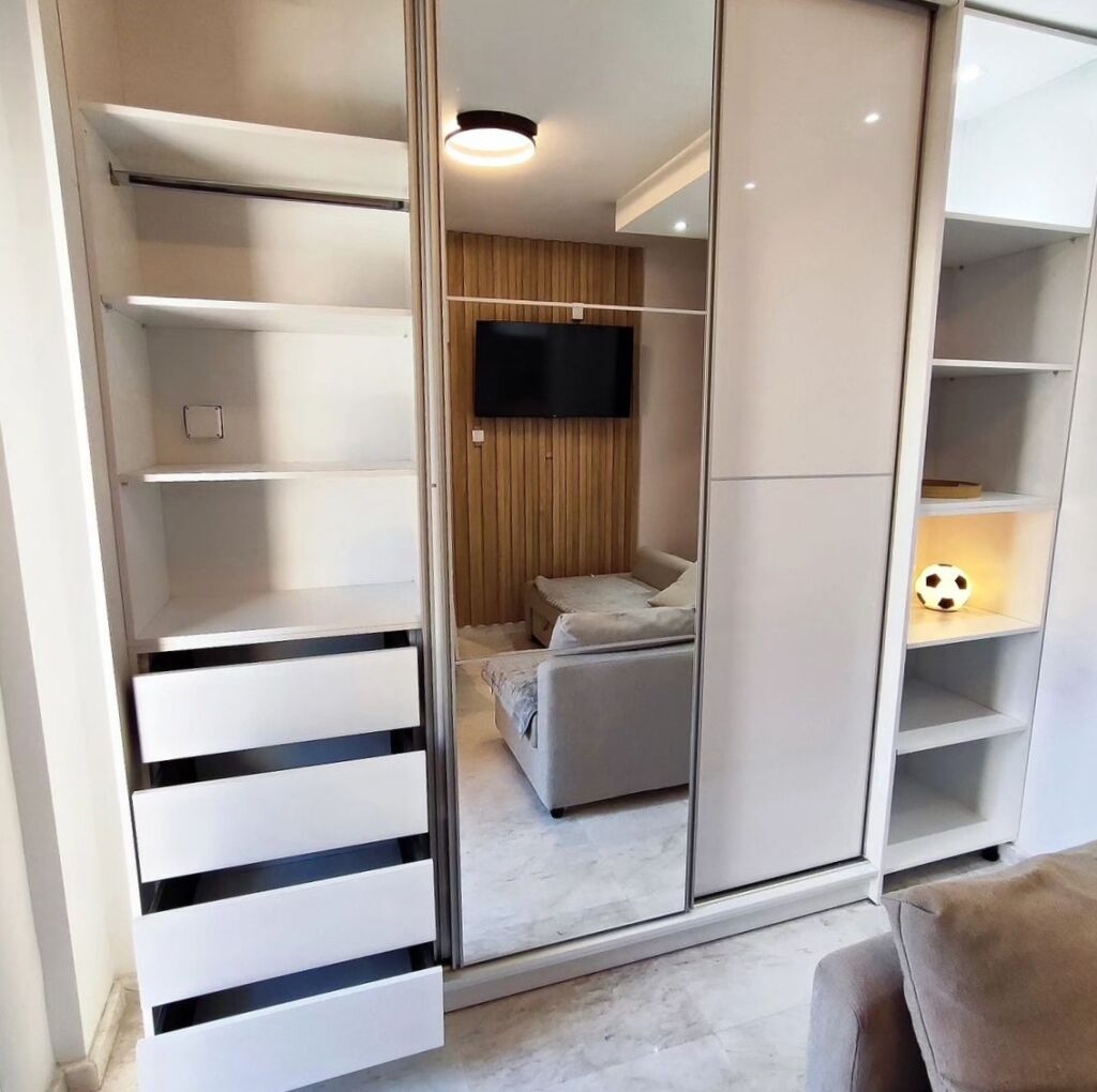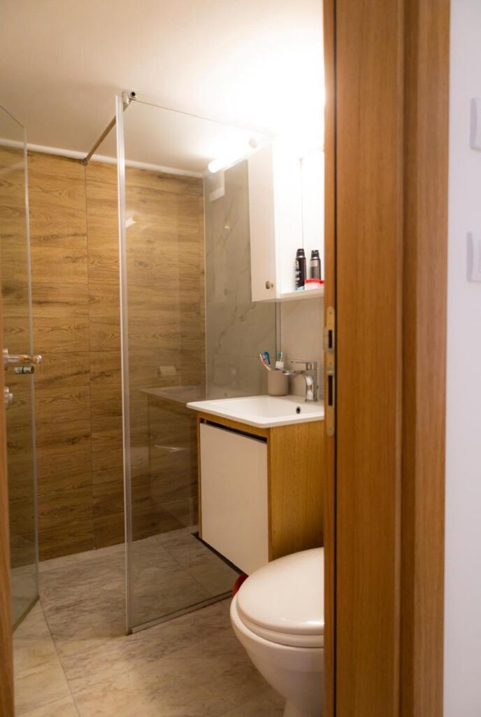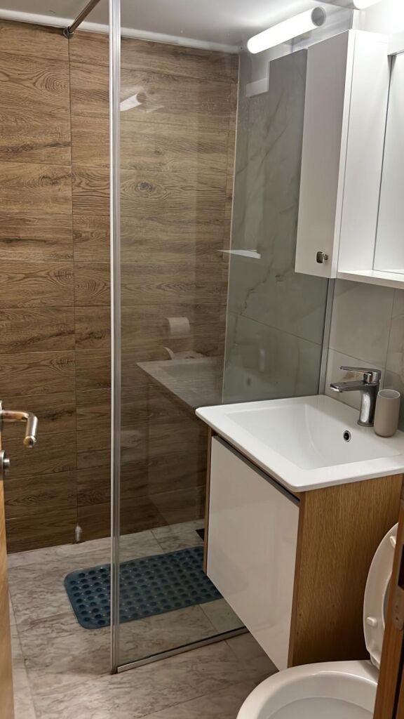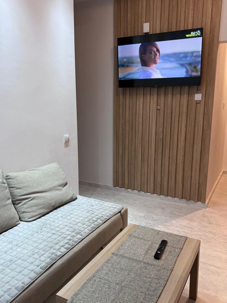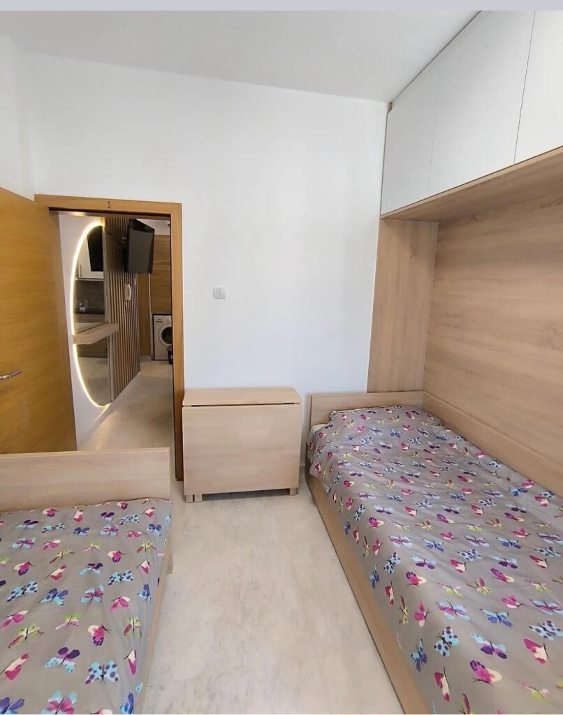 Interiorul apartamentului este proiectat funcțional și modern pentru a oferi oaspeților confort maxim, cu un aparat de aer condiționat care permite menținerea unei temperaturi plăcute pe tot parcursul zilei. Pentru momente de relaxare și agrement, sunt disponibile un televizor inteligent cu un pachet de canale IPTV și internet WiFi fiabil, în timp ce bucătăria oferă tot ce este necesar pentru prepararea ușoară a meselor, inclusiv o plită vitroceramică cu două zone de încălzire, un grătar portabil cu inducție și un frigider cu compartiment congelator. O doză suplimentară de confort este oferită de electrocasnice mici, cum ar fi aparatele de cafea cu filtru, fierbătoarele de apă și storcătoarele de fructe, care permit o împrospătare rapidă și ușoară în liniștea apartamentului, în timp ce disponibilitatea unei mașini de spălat facilitează semnificativ organizarea sejurului, în special pentru familii și oaspeții care planifică o vacanță mai lungă.