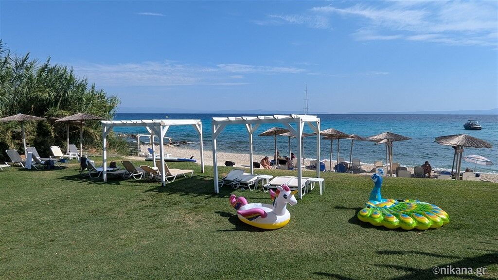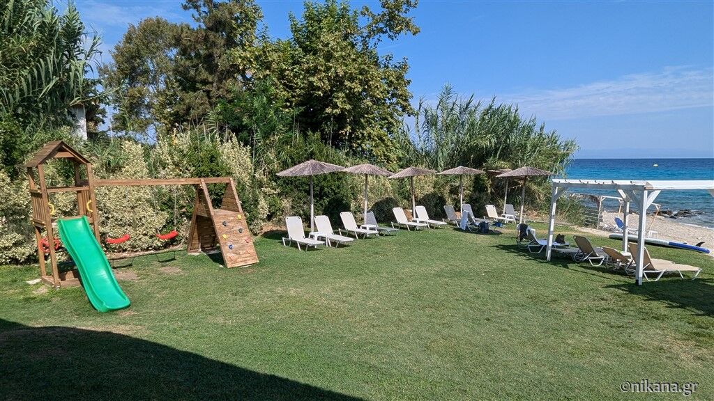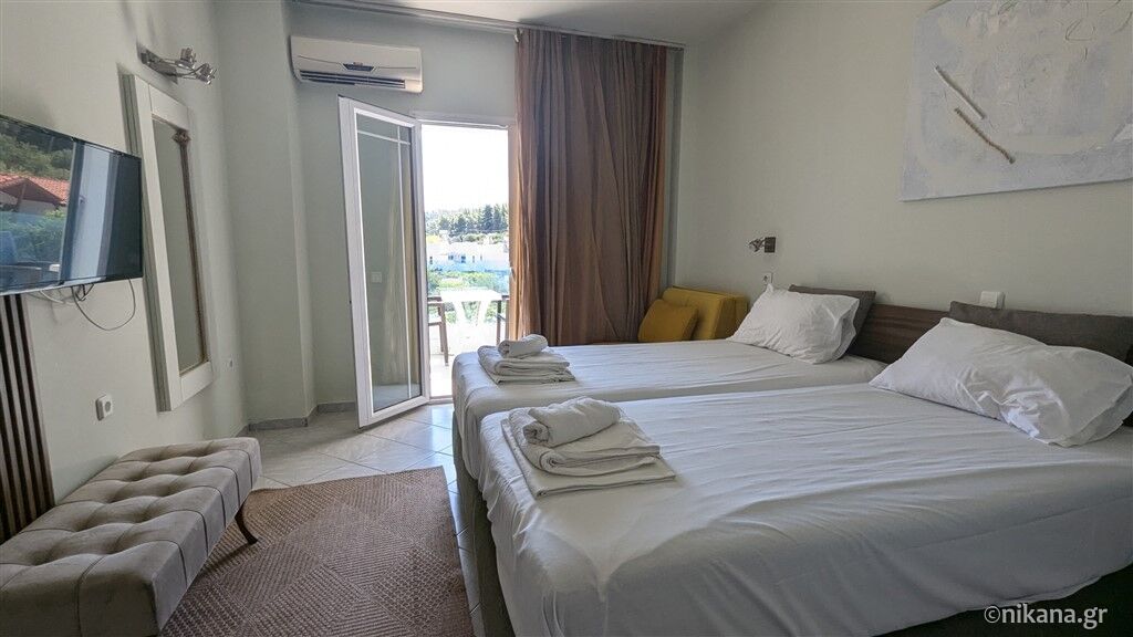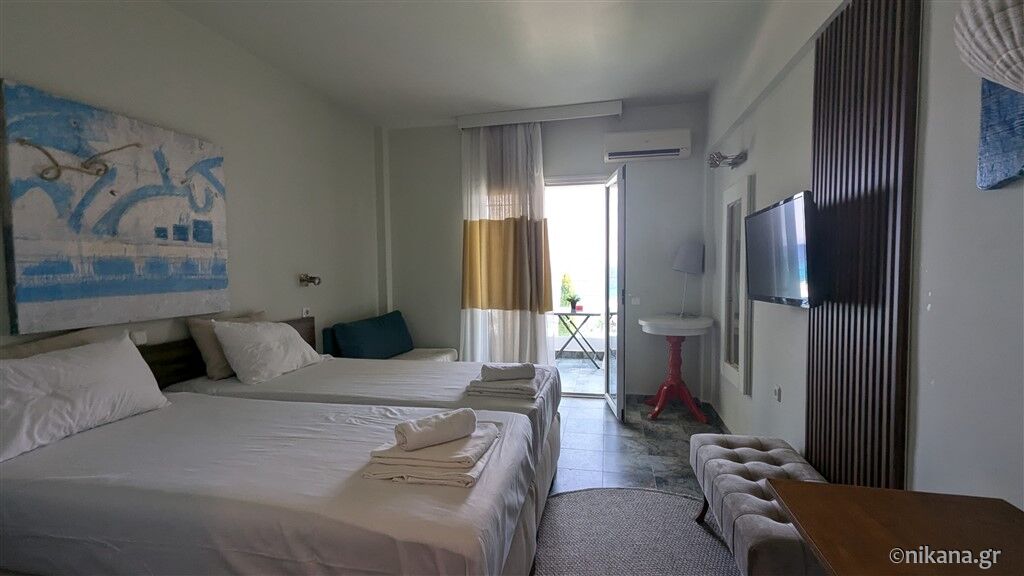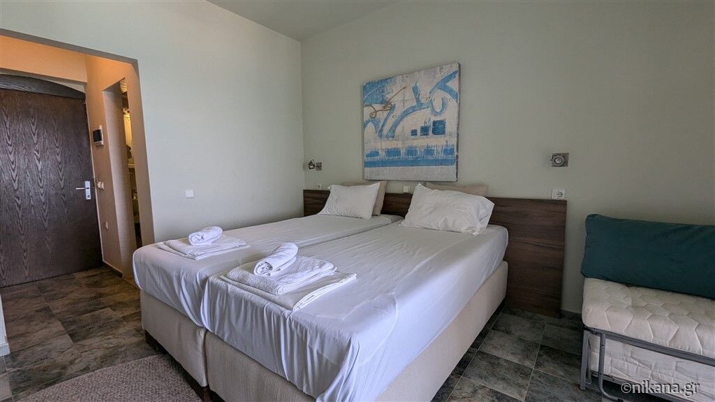 Camerele sunt elegant și funcțional mobilate pentru un sejur plăcut. Sunt dotate cu aer condiționat, internet, televizor cu canale prin satelit, seif, uscător de păr, baie cu duș cu perdea (fără cadă, doar cu faianță), frigider și balcon privat. Camerele de la nivelul inferior care dau în curte au și plase de protecție contra insectelor. Toate camerele cu trei paturi au vedere spre curte, în timp ce cele cu două paturi au vedere directă sau laterală la mare (contra cost) sau vedere la curte.
