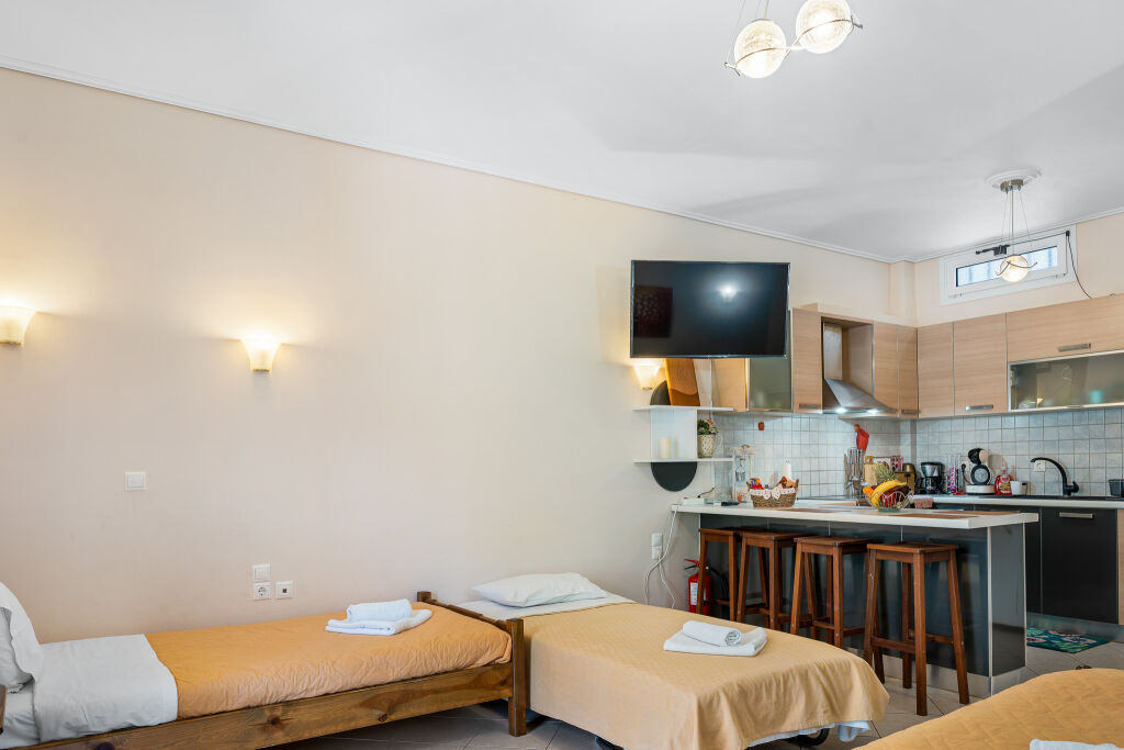 Vila Rania dispune de cinci studiouri triple foarte spațioase, cu o suprafață de aproximativ 38m2. Acestea sunt dotate cu un pat matrimonial și un pat simplu, cu posibilitatea de a adăuga un pat suplimentar (o structură metalică cu o saltea puțin mai subțire).