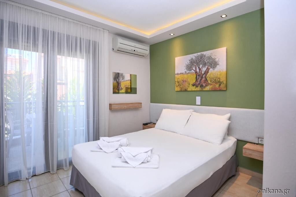 Studiourile triple au un pat matrimonial și unul simplu, în timp ce studiourile duble au un pat matrimonial. Apartamentul are un pat matrimonial în dormitor și o canapea extensibilă pentru două persoane în sufragerie, unde se află și bucătăria. Unitățile de cazare sunt dotate cu aer condiționat, internet, televizor, plase de țânțari, bucătărie utilată cu un frigider cu o mică cameră de congelare (doar în apartament există un mic cuptor), duș cu cortină în baie și terasă cu masă și scaune și un suport pentru uscarea hainelor. Patul și prosoapele se schimbă la fiecare trei zile.