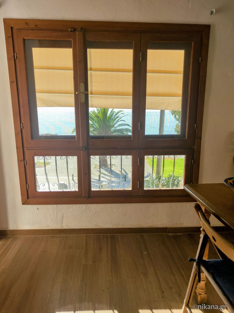 Apartamentul cu patru locuri de la parter este modern și nou amenajat. În dormitor se află o pat matrimonial, o șifonier și aer condiționat, iar în living se găsește un televizor, un ventilator de tavan, o bucătărie utilată cu un microunde și un frigider mare cu congelator, precum și două paturi de o persoană cu un pat slide out sub unul dintre ele. Baia are o cabină de duș cu perdea. În fața apartamentului se află o verandă înconjurată de un zid cu o copertină, cu o umbrelă și o garnitură de mobilier pentru relaxare, precum și o vedere laterală la mare și curte.