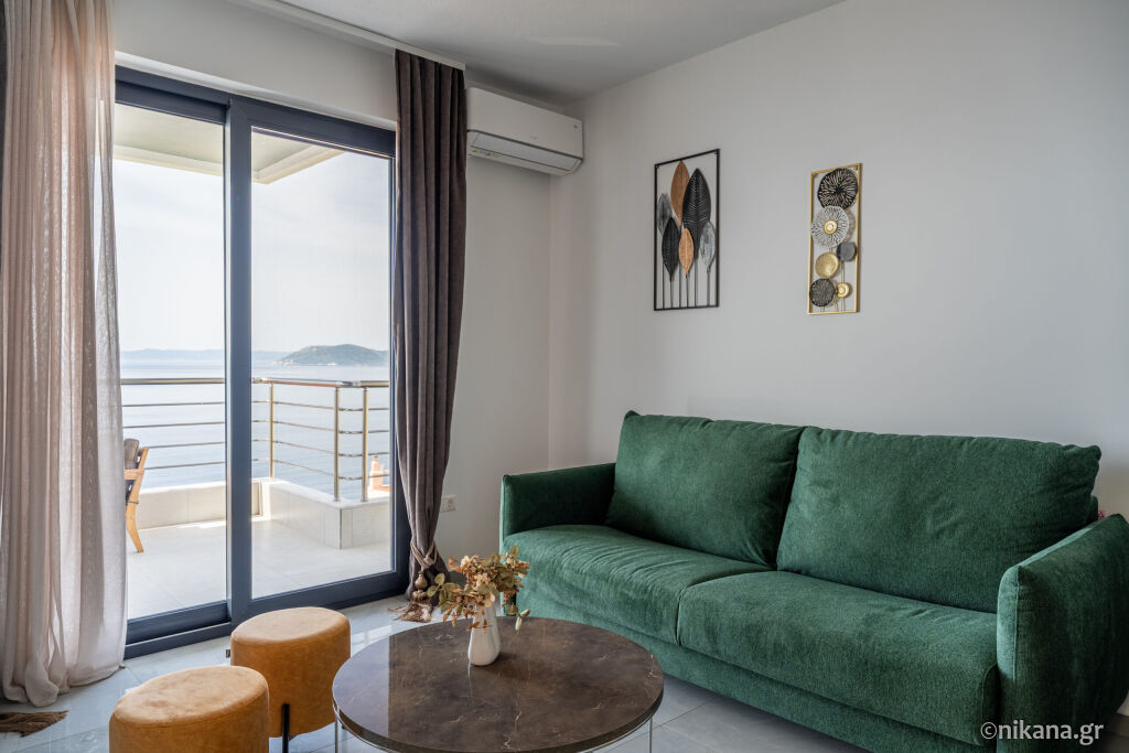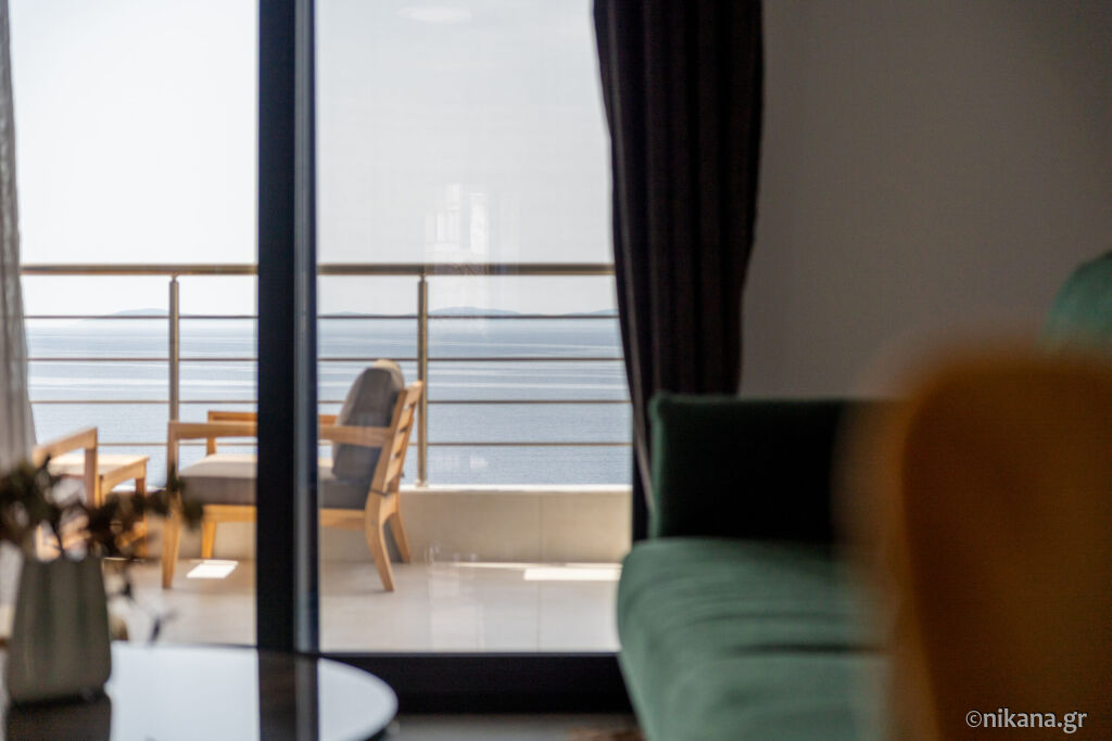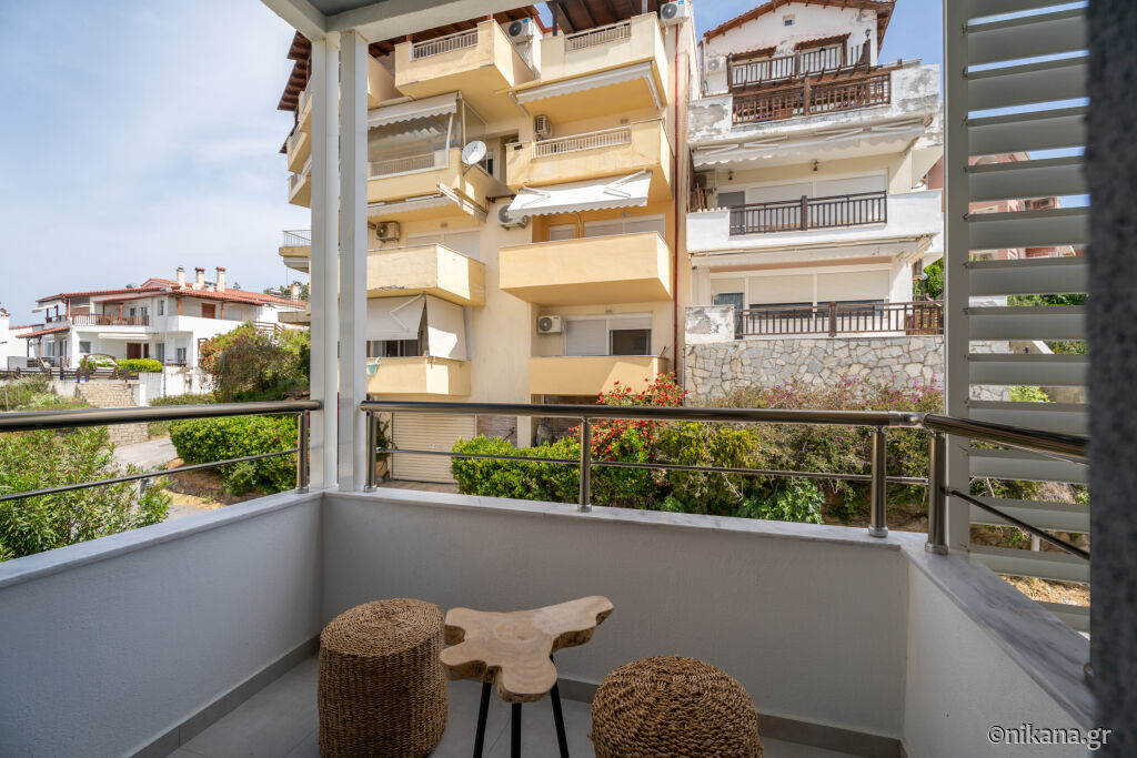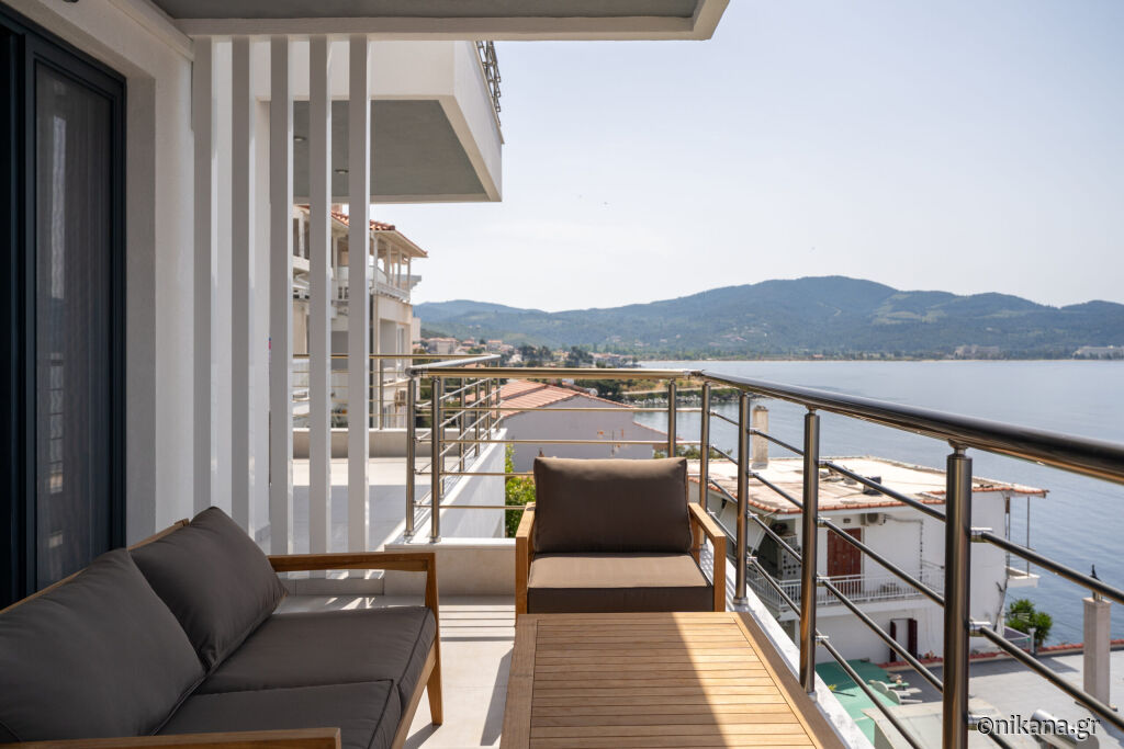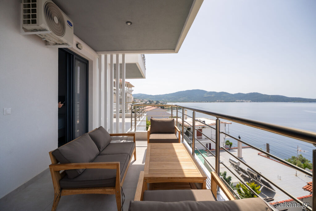 Apartamentul dispune de două balcoane, fiecare fiind conceput ca un colț special pentru relaxare în aer liber. Balconul mai spațios, accesibil din sufragerie și un dormitor, este echipat cu o garnitură de mobilier pentru relaxare și oferă o priveliște panoramică către mare, oferind o senzație de lățime, liniște și conectare completă cu mediul înconjurător. Celălalt balcon, mai mic, accesibil din celălalt dormitor, le permite oaspeților să se bucure de priveliștea către clădirile din jur și atmosfera animată a locului, creând o dimensiune suplimentară de confort și comoditate.
