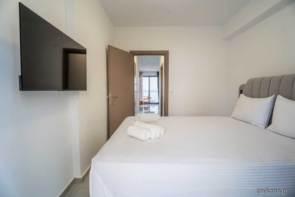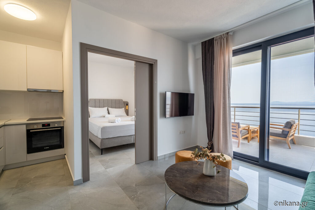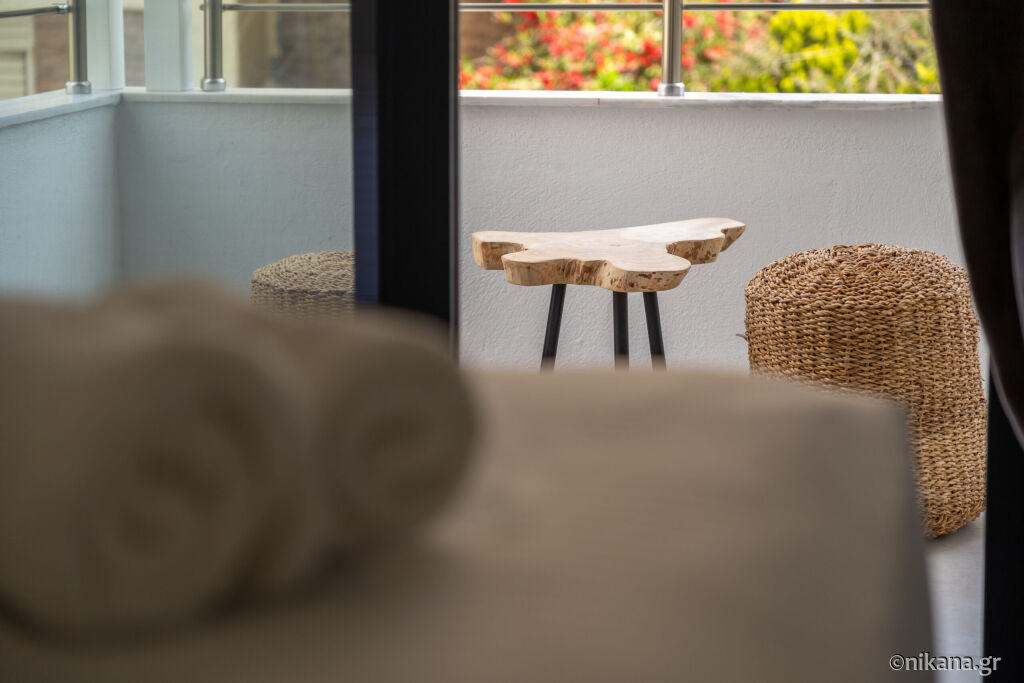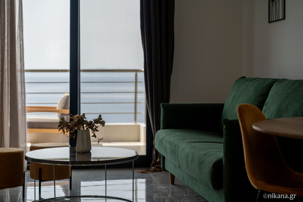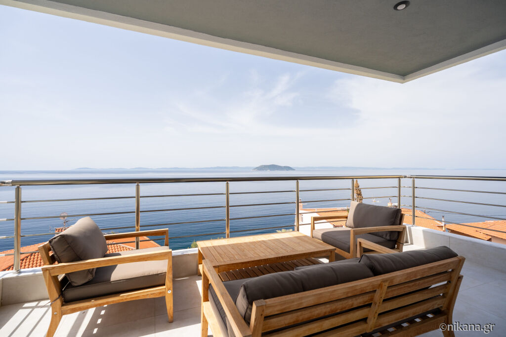 Apartamentul dispune de două balcoane, fiecare fiind conceput ca un colț special pentru relaxare în aer liber. Balconul mai spațios, accesibil din sufragerie și un dormitor, este echipat cu o garnitură de mobilier pentru relaxare și oferă o priveliște panoramică către mare, oferind o senzație de lățime, liniște și conectare completă cu mediul înconjurător. Celălalt balcon, mai mic, accesibil din celălalt dormitor, le permite oaspeților să se bucure de priveliștea către clădirile din jur și atmosfera animată a locului, creând o dimensiune suplimentară de confort și comoditate.