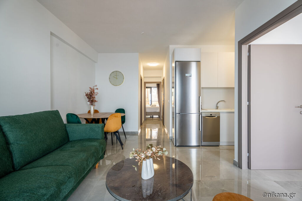 Apartamentul este situat la primul etaj al clădirii cu lift și este destinat cazării a cel mult cinci adulți. Este vorba despre un spațiu modern și contemporan, modelat pentru a oferi o senzație de ușurință și confort încă de la prima vedere. Partea centrală este compusă dintr-o sufragerie plăcută conectată cu bucătăria și zona de luat masa, creând o întregire armonioasă ideală pentru adunările de familie, mesele comune și momentele de relaxare. Cele două dormitoare separate cu paturi duble oferă liniște și intimitate, în timp ce canapeaua suplimentară din sufragerie permite cazarea confortabilă a încă unei persoane. Întregul spațiu emană o atmosferă plăcută, iar șederea în apartament pare simplă, confortabilă și lipsită de griji.