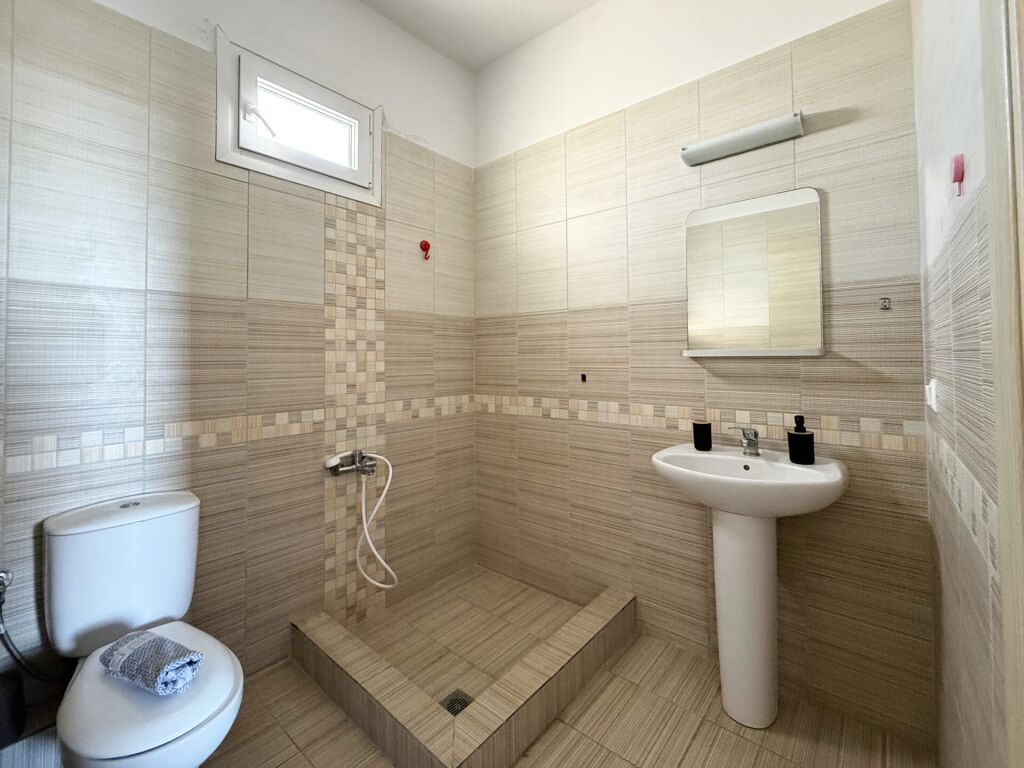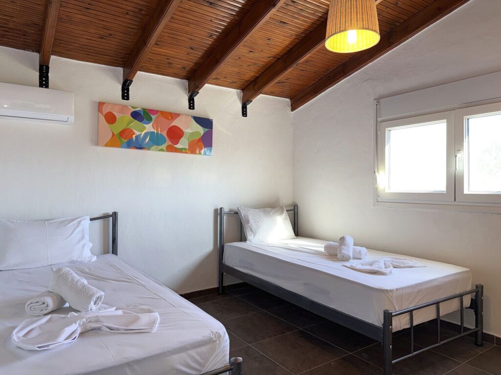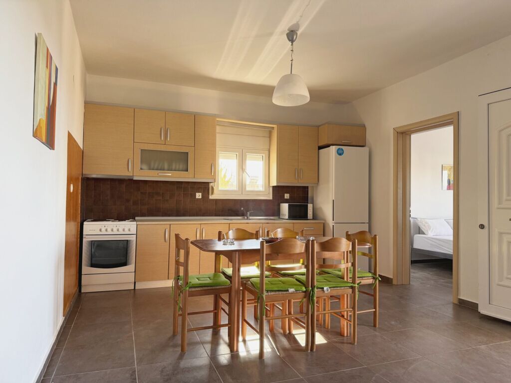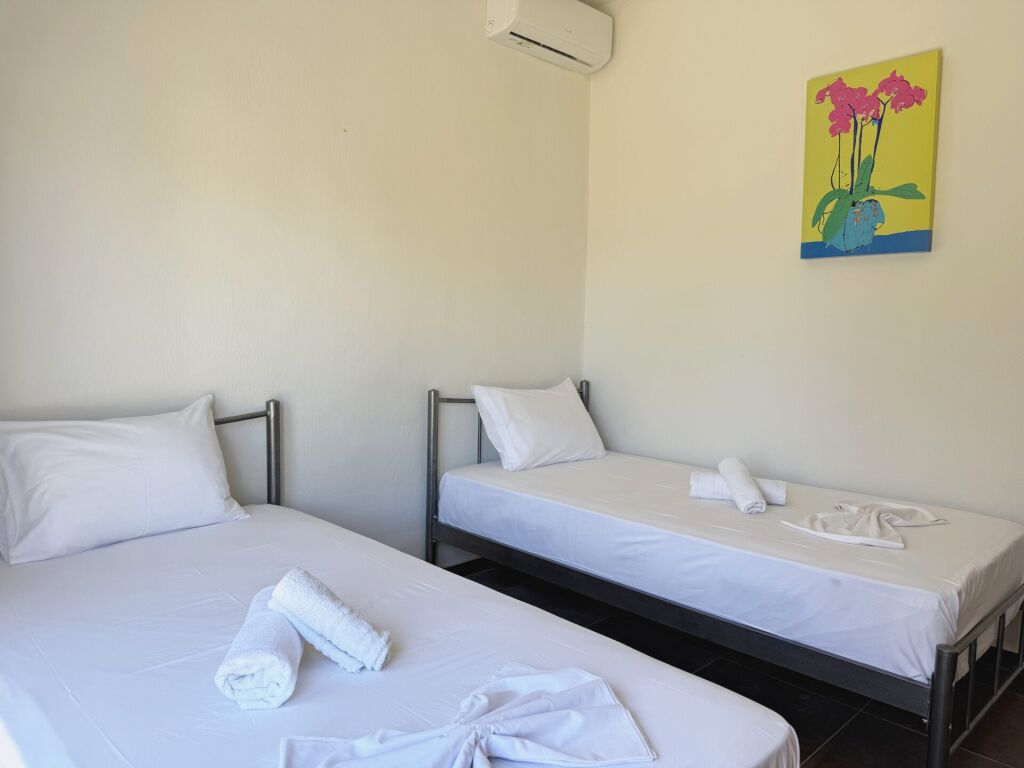 Un apartament este situat la parterul înalt și poate găzdui până la șapte adulți. Este compus dintr-o sufragerie cu bucătărie complet utilată și zonă de luat masa, trei dormitoare și baie. Într-un dormitor se află un pat de dimensiuni mari, în timp ce celelalte două dormitoare sunt dotate cu câte două paturi de o persoană. În sufragerie se găsește o canapea pentru o persoană.