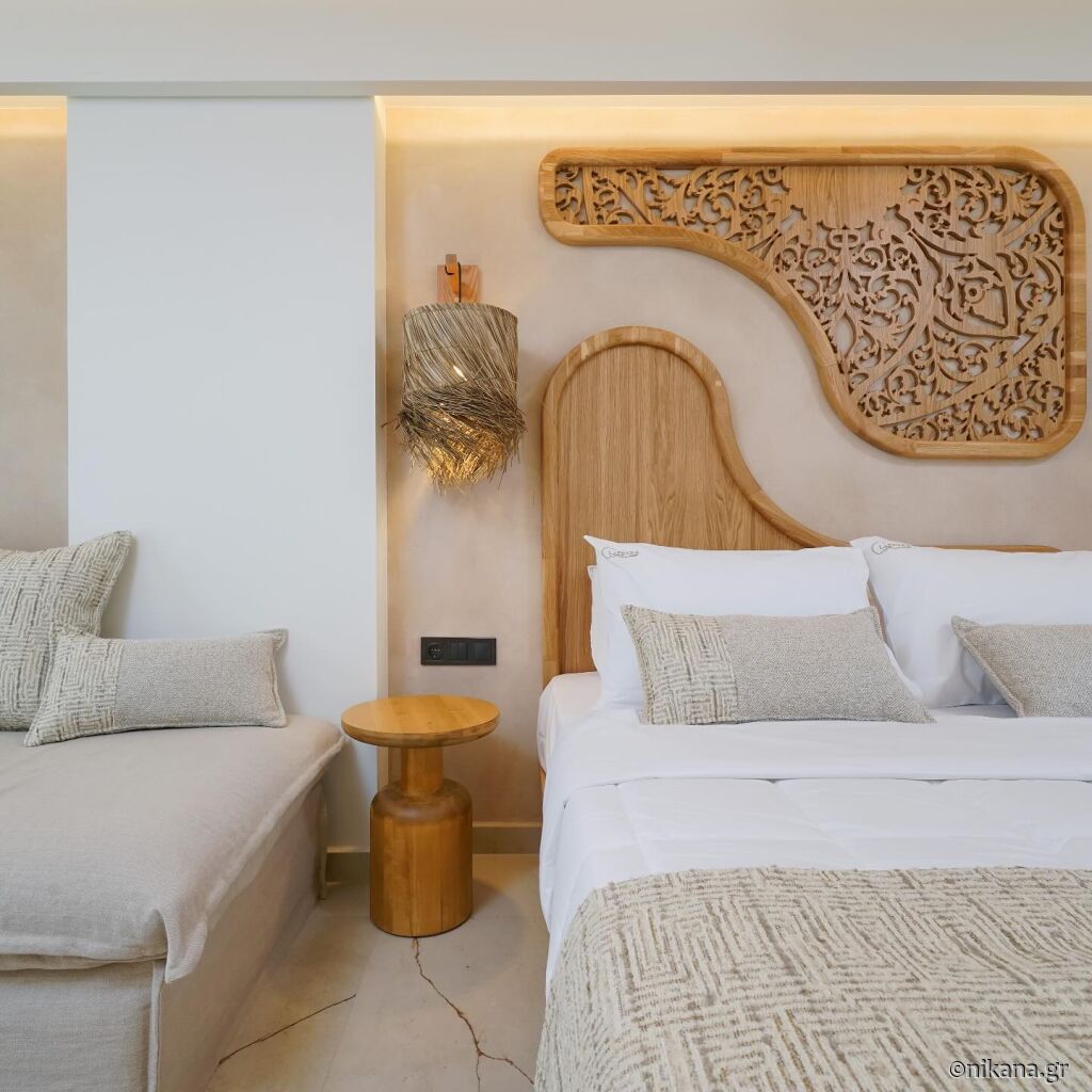 În clădirea principală, unde se află recepția, există opt camere de aproximativ 20m², concepute pentru două sau trei persoane. Există patru camere triple în total - trei sunt situate la primul etaj și oferă vedere la mare, în timp ce una este situată la parterul superior și are vedere la piscină. Toate camerele triple sunt dotate cu un pat dublu și o canapea extensibilă de o persoană. Există, de asemenea, patru camere duble, fiecare cu un pat dublu. Una dintre ele are vedere la mare, este situată la primul etaj, la colțul clădirii, și are o terasă circulară. A doua cameră cu vedere la munte este situată la primul etaj, deasupra recepției. Celelalte două camere au vedere la piscină - una este la parterul superior, cealaltă la parter.