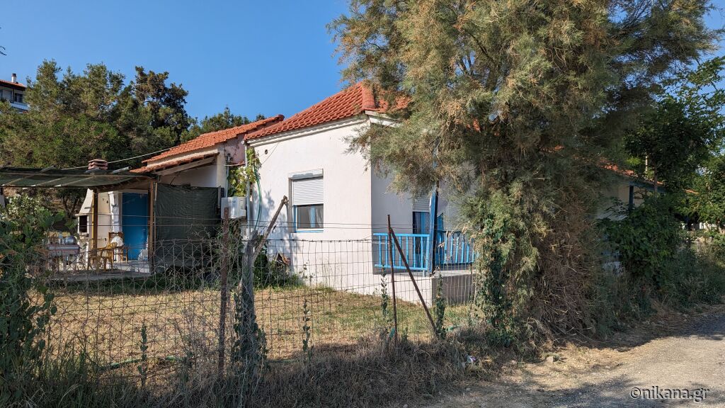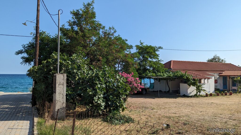 Se află la o distanță de un kilometru de centrul strict al Limenarije. Plaja în fața vilei are o lungime de 2 km și are atât zone cu nisip, cât și zone pietroase. Cu o băutură achiziționată, turiștii pot folosi șezlongurile de la hotelul Blue View, care se află chiar lângă vila Topouzis, în fața căruia plaja este nisipoasă, atât în apă, cât și pe pământ.