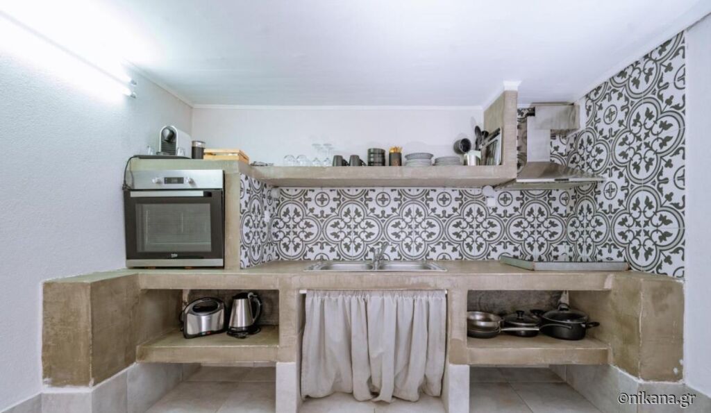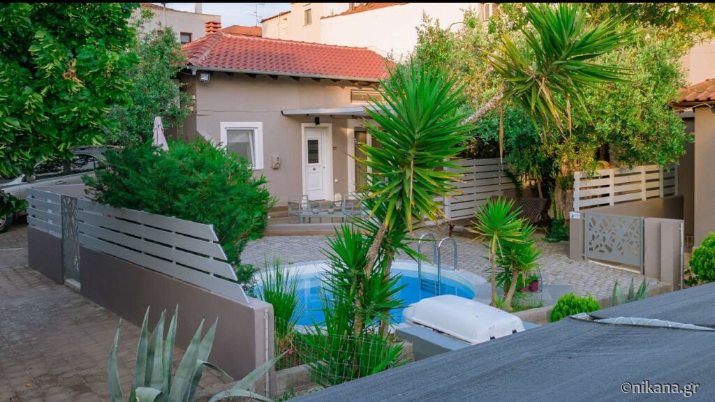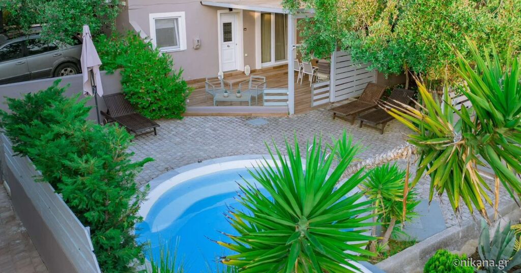 A treia clădire este o casă drăguță pe două nivele (mezonetă), potrivită pentru o familie de patru persoane. Casa are o cameră dublă în parter, baie și bucătărie, iar la mansardă, care nu este separată cu ușă, se află încă două paturi de o persoană. În fața casei este o terasă foarte spațioasă cu mobilier pentru relaxare și confort, iar lângă casă există și un loc de parcare. Dacă doriți o opțiune de cazare mai intimă aproape de plajă, poate că nu există o alegere mai bună decât această casă în Potos. În fața mezonetei se află și o mică piscină folosită doar de oaspeții acestui apartament. Suprafața mezonetei este de 45m2.