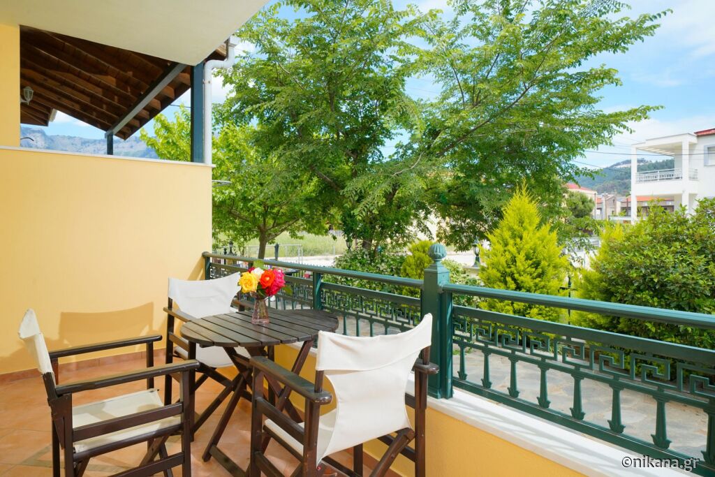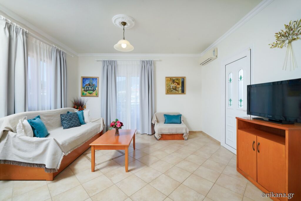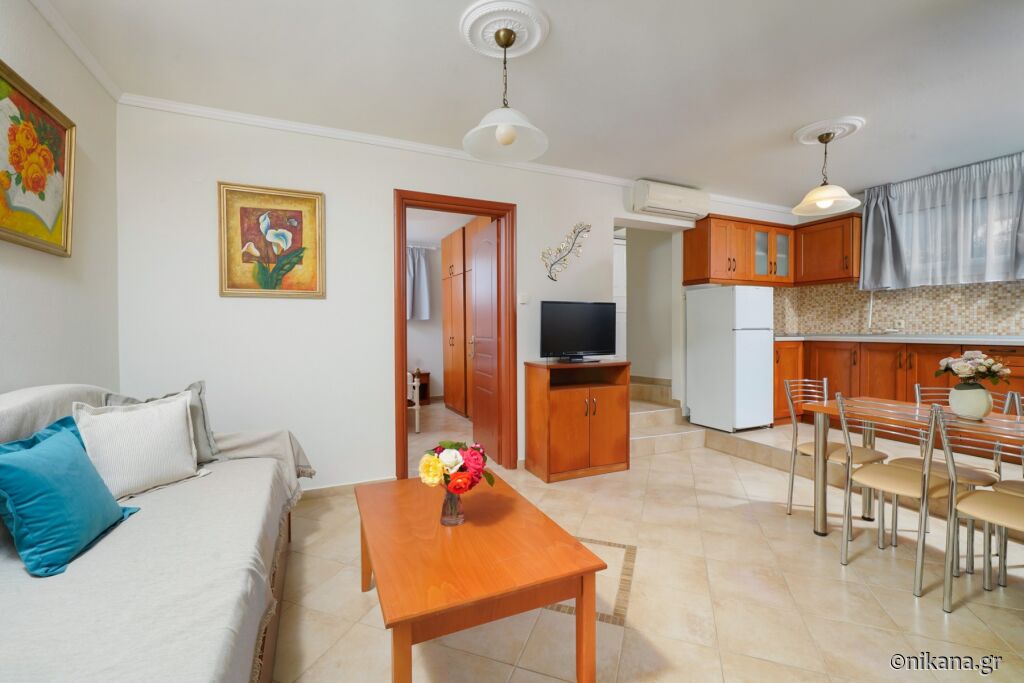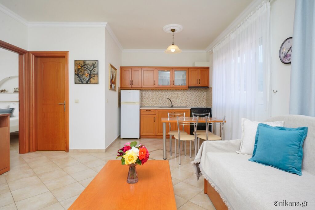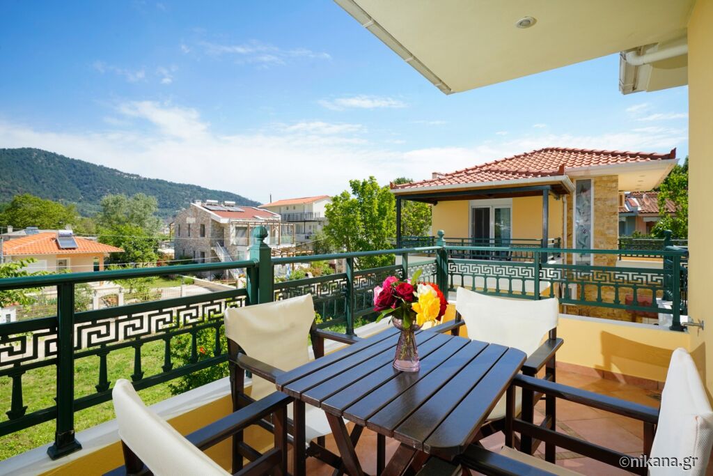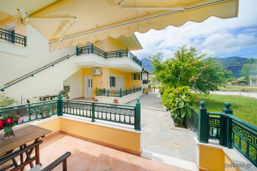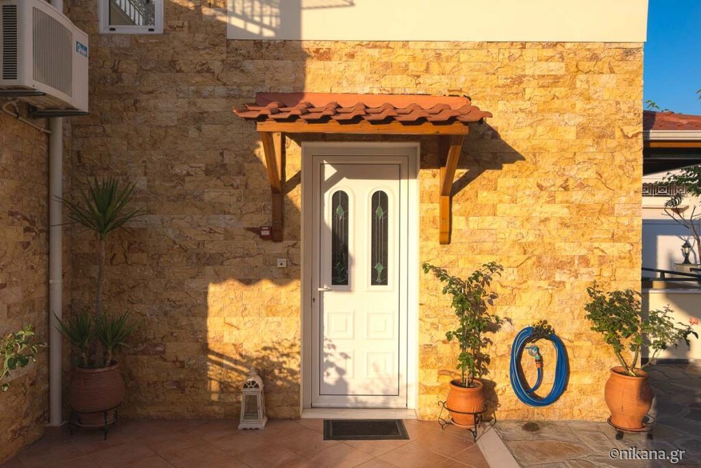 Cazarea este situată în Skala Potamia, în mijlocul marii golfului cunoscut sub numele de Golden Beach. Este situat într-o locație liniștită, înconjurat de frumoase vile de închiriat, cu vedere la mare sau la muntele care înalță deasupra întregului golf. Este de o calitate foarte bună și se află la doar 2-3 minute de mers pe jos de plaja cu nisip și adâncime mică.