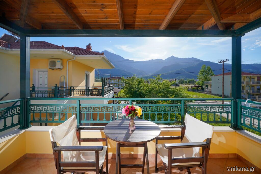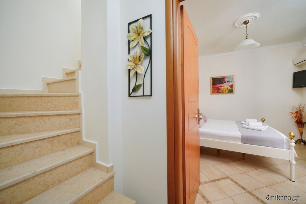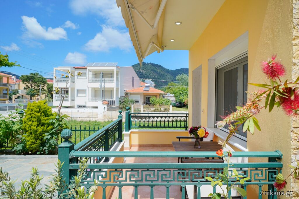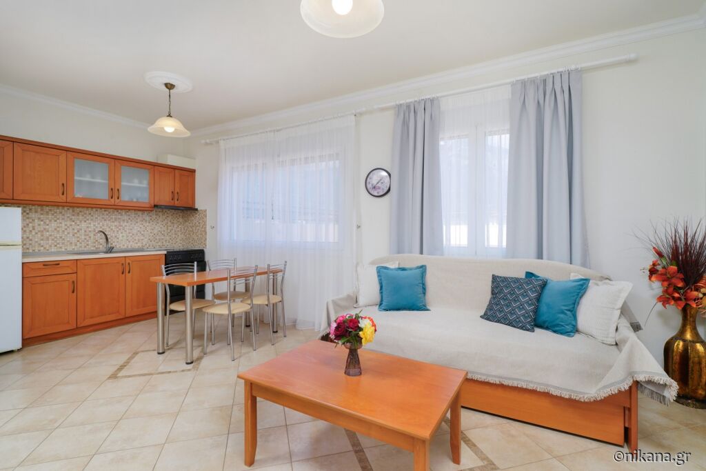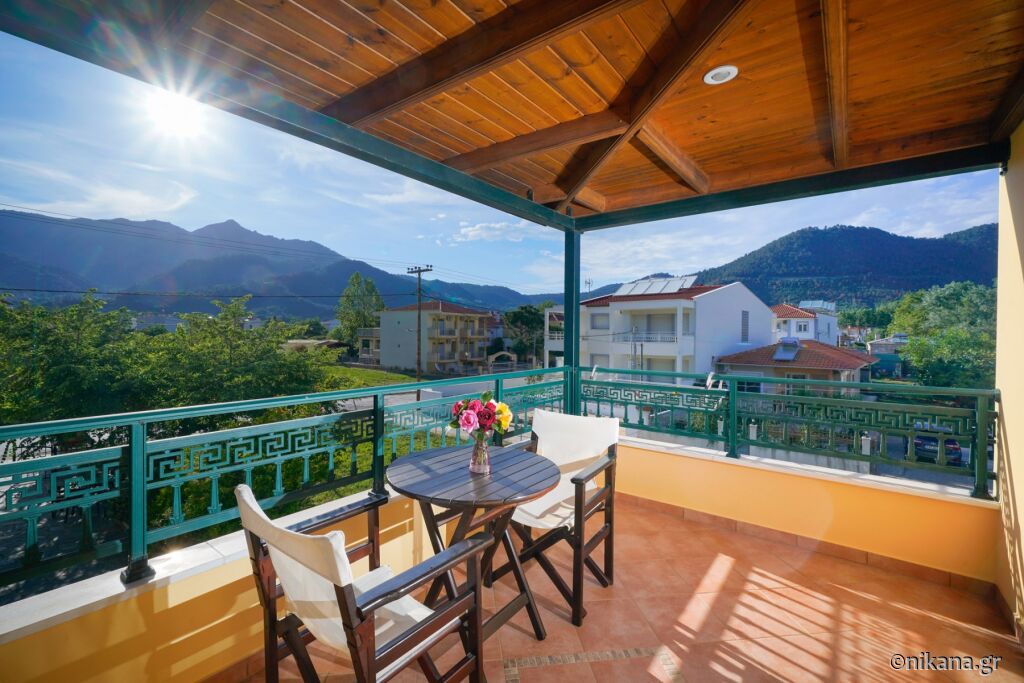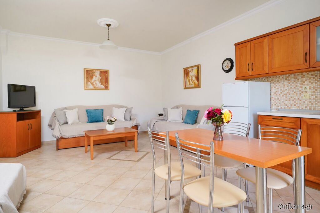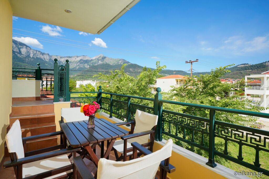 Cazarea este situată în Skala Potamia, în mijlocul marii golfului cunoscut sub numele de Golden Beach. Este situat într-o locație liniștită, înconjurat de frumoase vile de închiriat, cu vedere la mare sau la muntele care înalță deasupra întregului golf. Este de o calitate foarte bună și se află la doar 2-3 minute de mers pe jos de plaja cu nisip și adâncime mică.