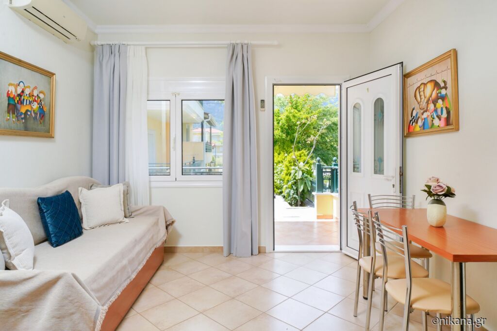 Apartamentul duplex (50m2) de la parter are două dormitoare (fiecare cu un pat matrimonial) și un salon cu o canapea pentru încă două persoane, astfel că capacitatea sa este de până la șase persoane.