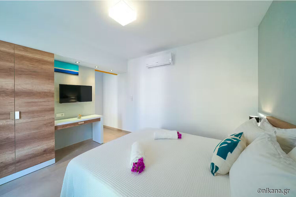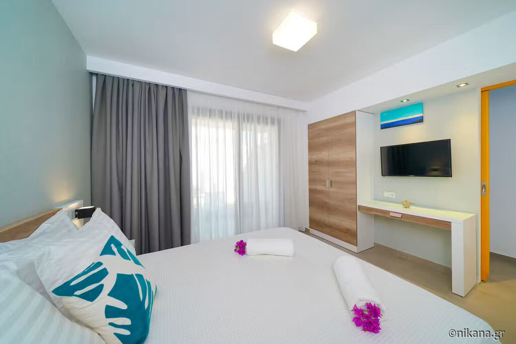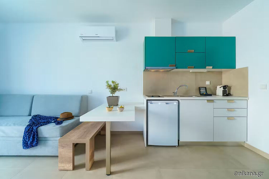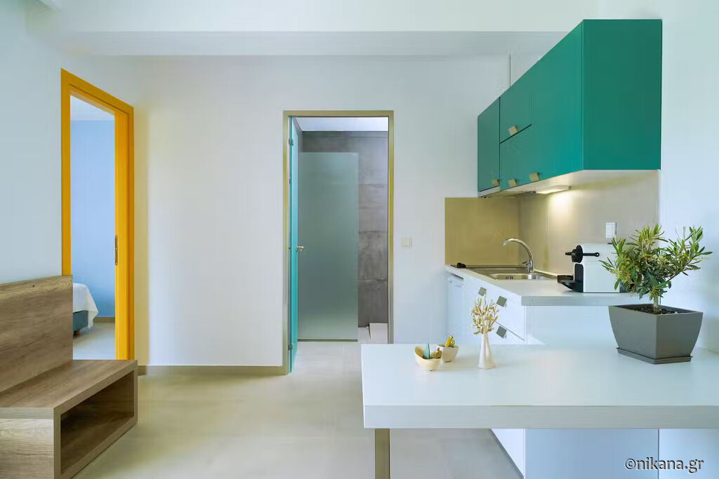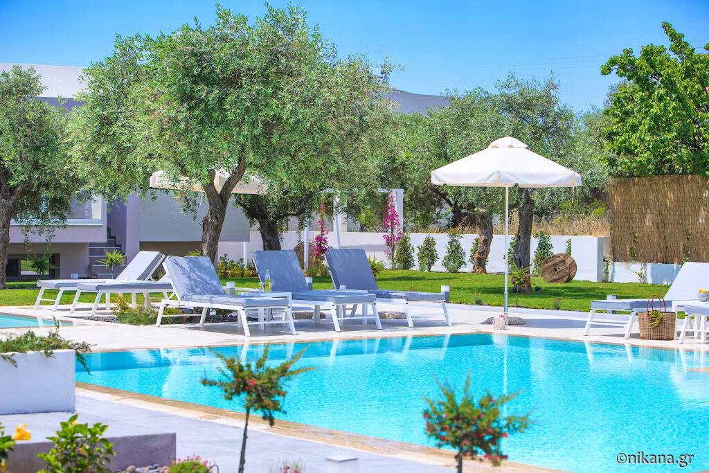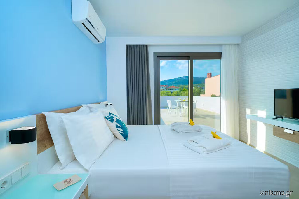 Este situat într-o zonă liniștită din Potos, la aproximativ 800m de plajă și la 700m de centru.