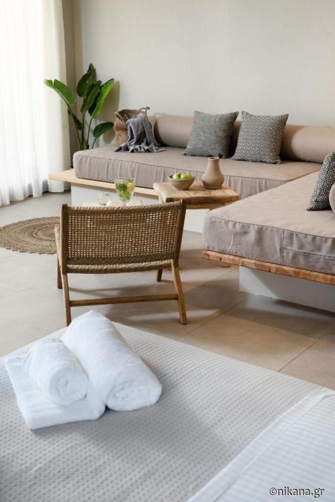 Apartamentul Sunrise Suite cu vedere la mare și piscină privată, fără bucătărie este format din două niveluri și poate găzdui maxim trei adulți și doi copii. La primul nivel se află două camere și o baie. O cameră are un pat dublu, în timp ce cealaltă cameră are o canapea extensibilă pentru două persoane. La al doilea nivel, pe galeria deschisă, se găsește un pat dublu. Veranda și balconul sunt echipate cu seturi de mobilier, oferind priveliști spre piscina privată și mare.