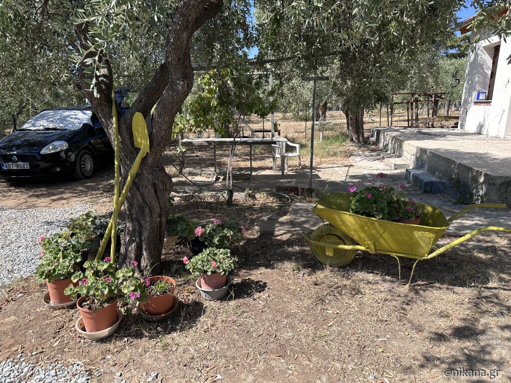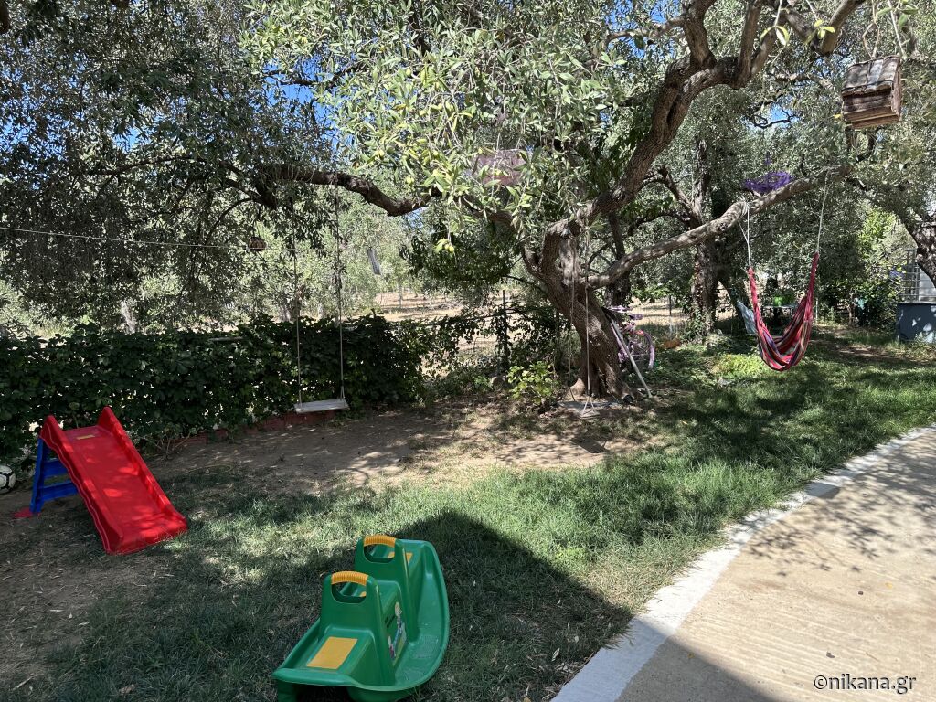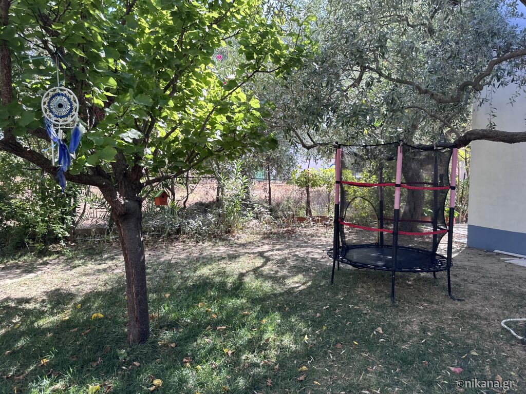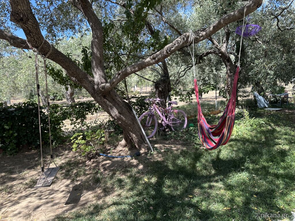În fața cazării se află o curte cu o mică pajiște, câteva leagăne și trei grătare cu ustensile pentru grătar, precum și o masă și scaune. Casa este înconjurată de măslini.